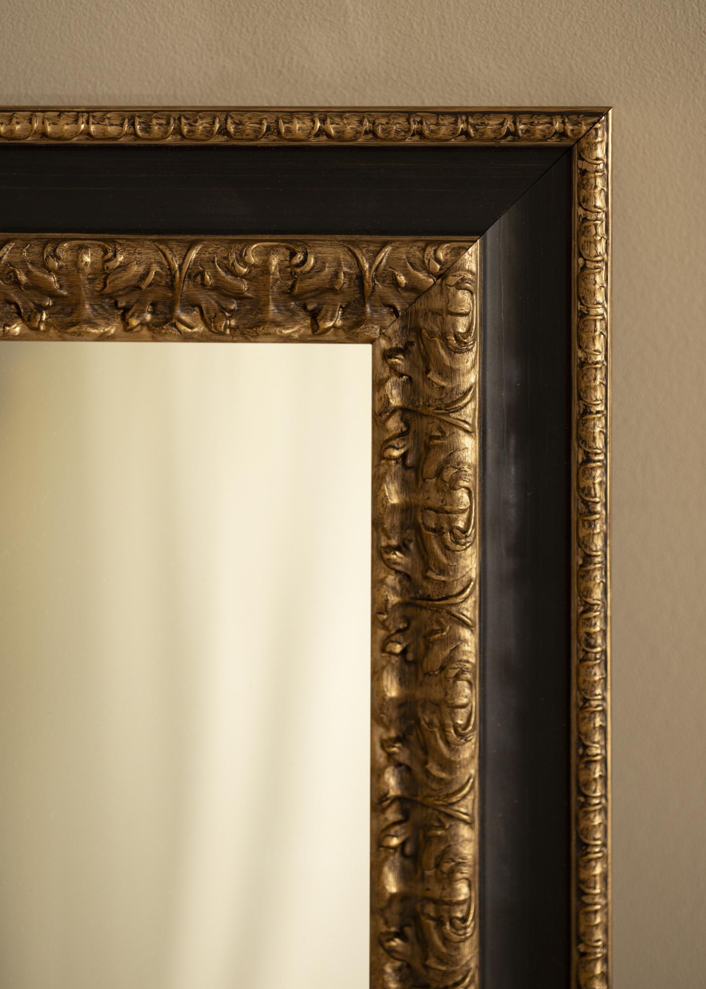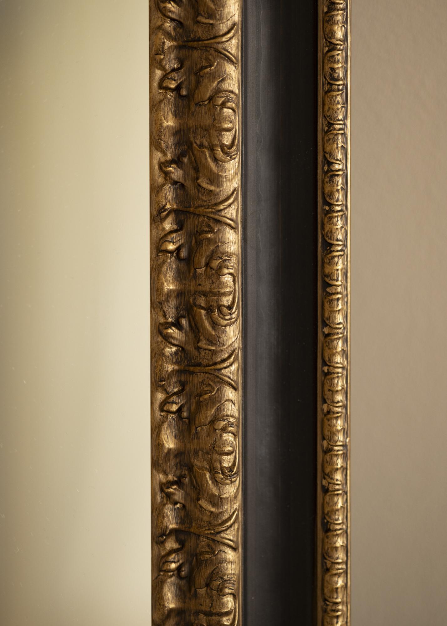 "Drottningholm Guld" е красиво огледало в ретро стил от Италия, изработено от фурнирована борова дървесина, която е ръчно рисувана. Огледалото има богато украсен златен профил с широка черна рамка, която придава на рамката своя елегантен вид.