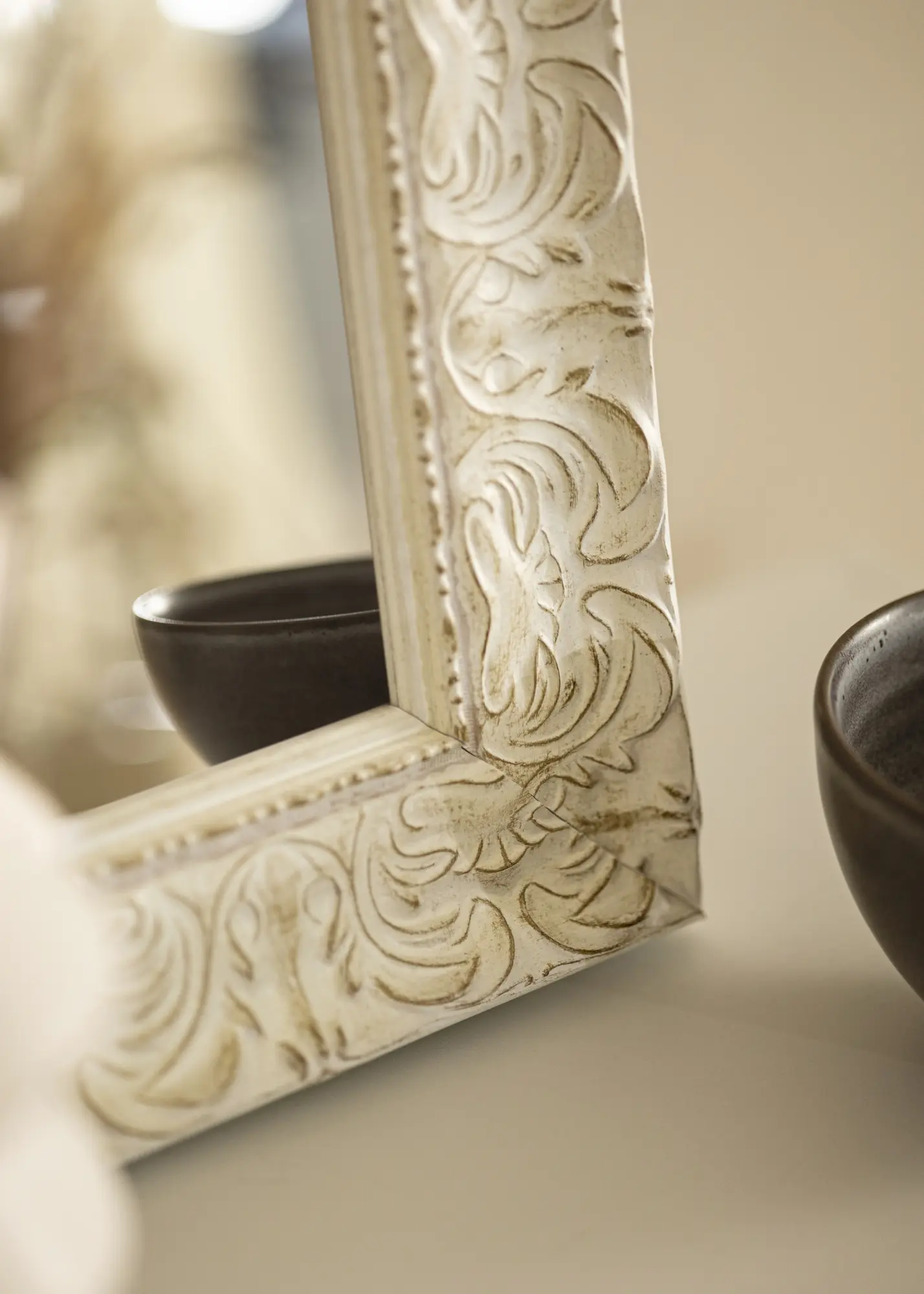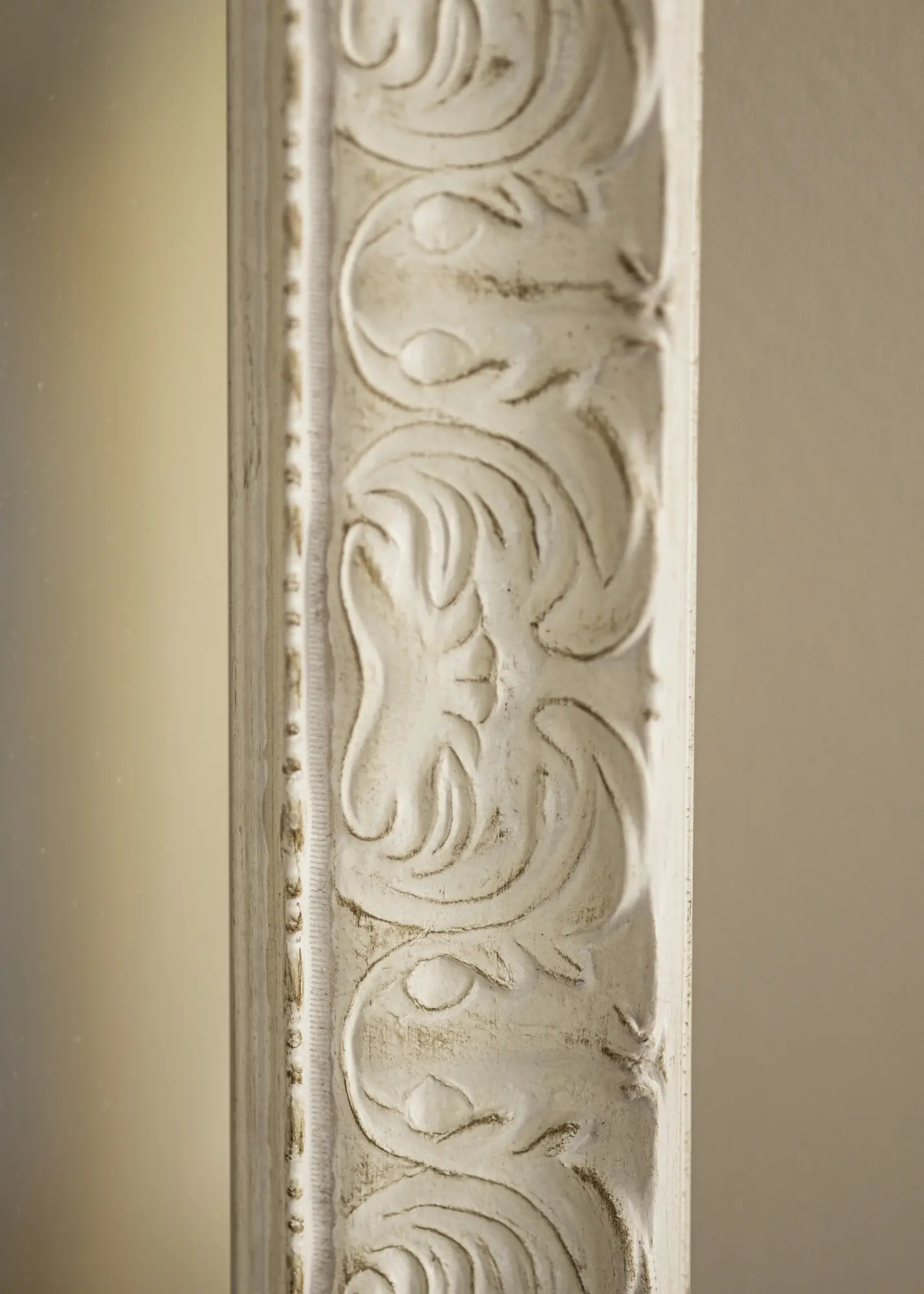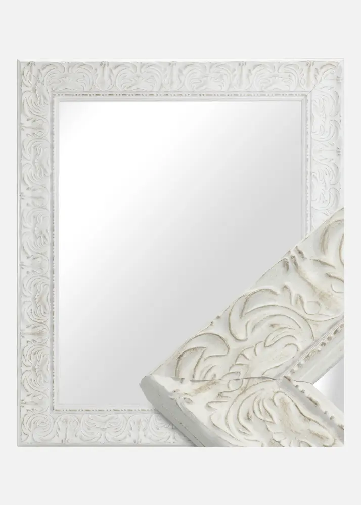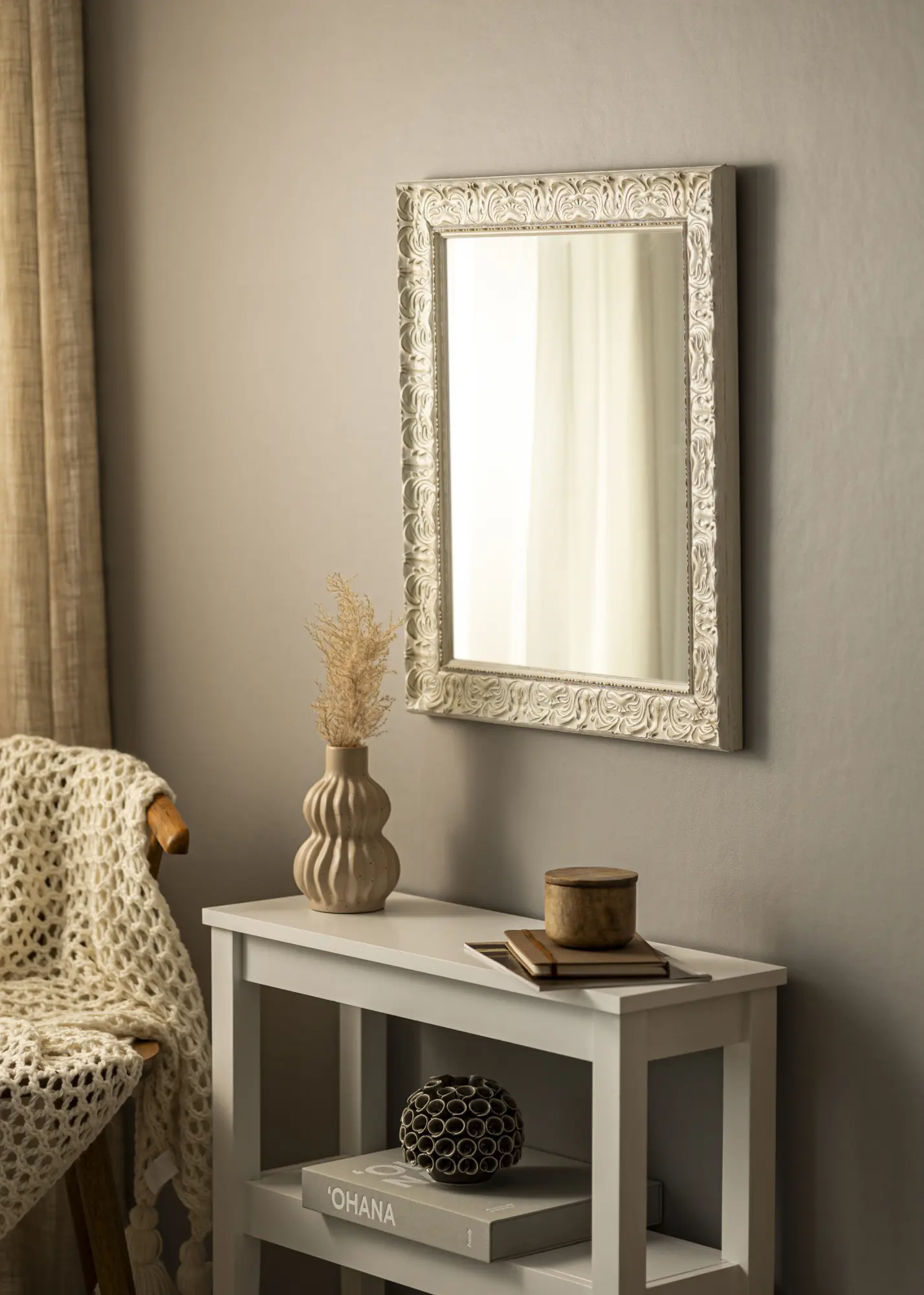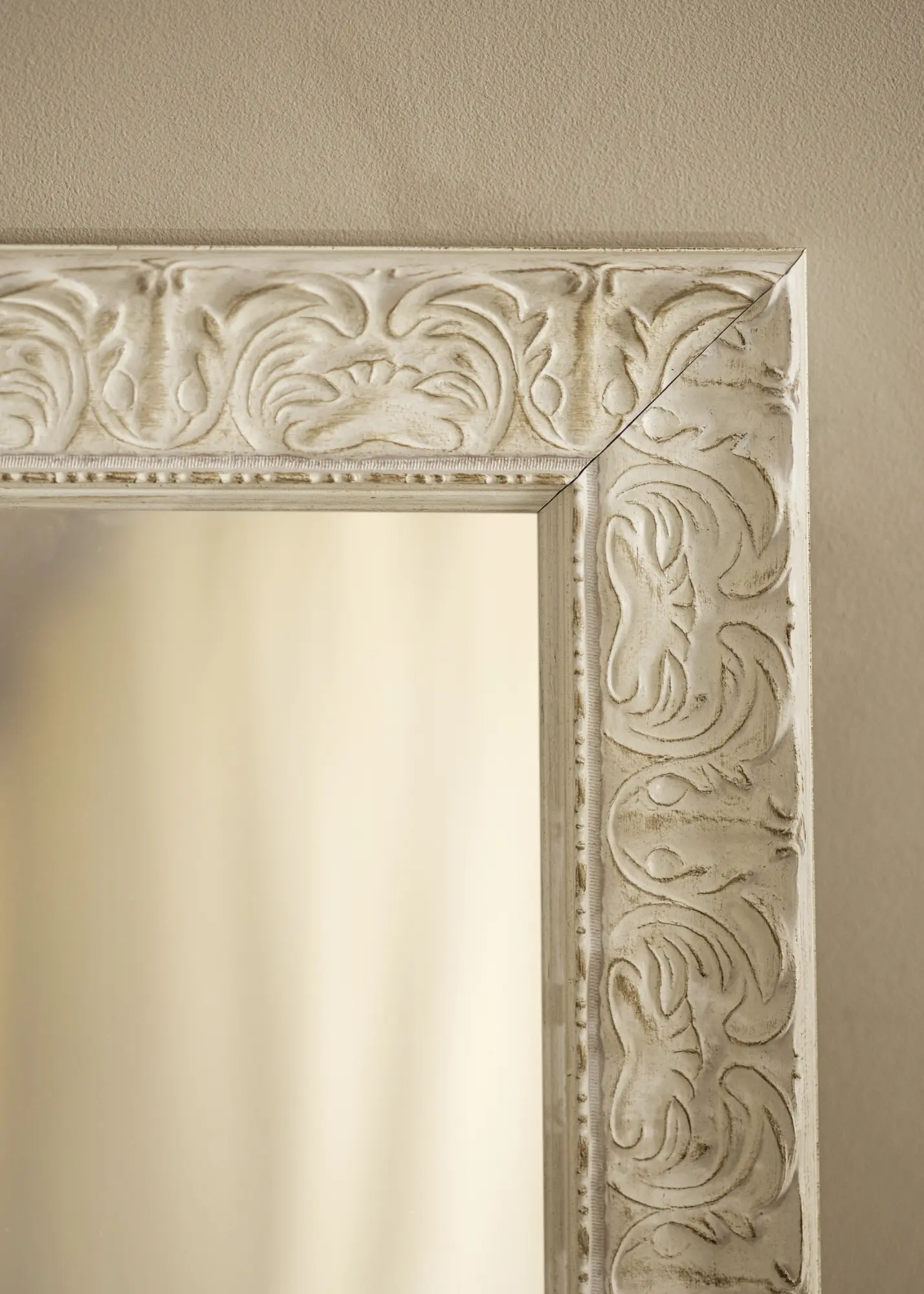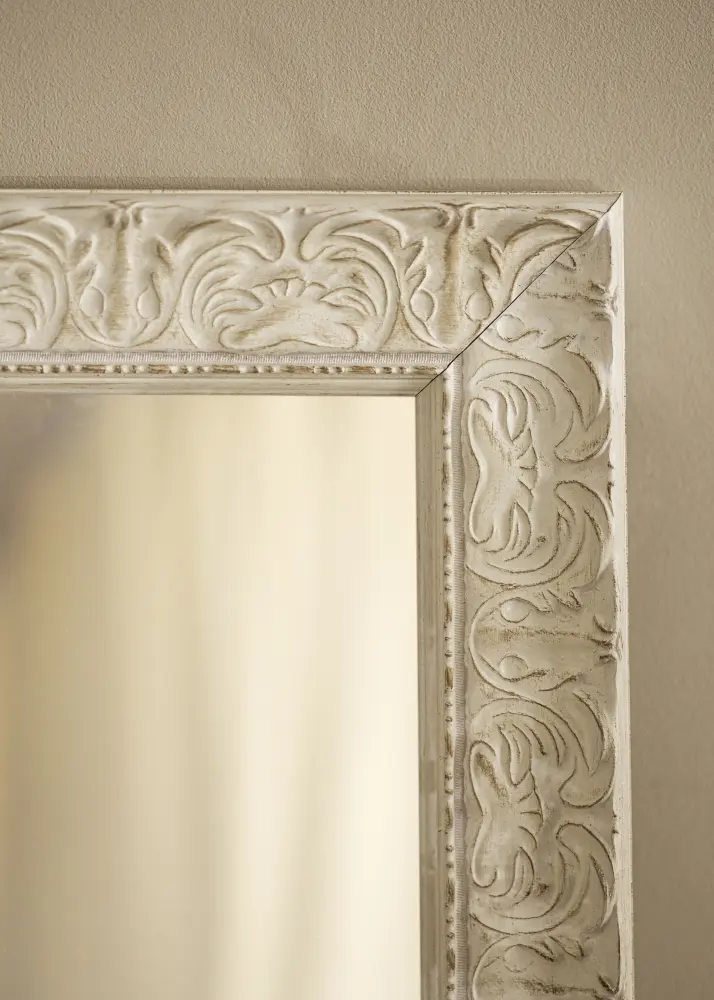 Античното бяло покритие на огледалото с декоративен релеф и леко изтъркана повърхност му придава уникален характер. Изкусните детайли усилват класическия му израз и го правят акцент на стаята. Независимо дали имате модерен или традиционен интериор, това огледало ще се впише идеално и ще добави нещо допълнително.