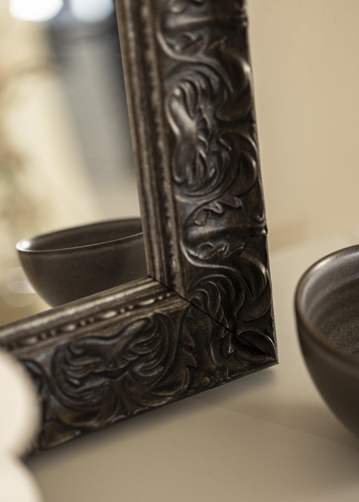 Рамката на Огледало Durham Черно е 70 мм широка, което придава на огледалото стабилност и солидно усещане. Дълбочината от 35 мм допринася за неговата стабилност и гарантира, че стои здраво на стената. Изработено от бор, това огледало има тъмно антично кафяво покритие, което му придава старинен вид и подчертава неговия класически и рустикален характер.