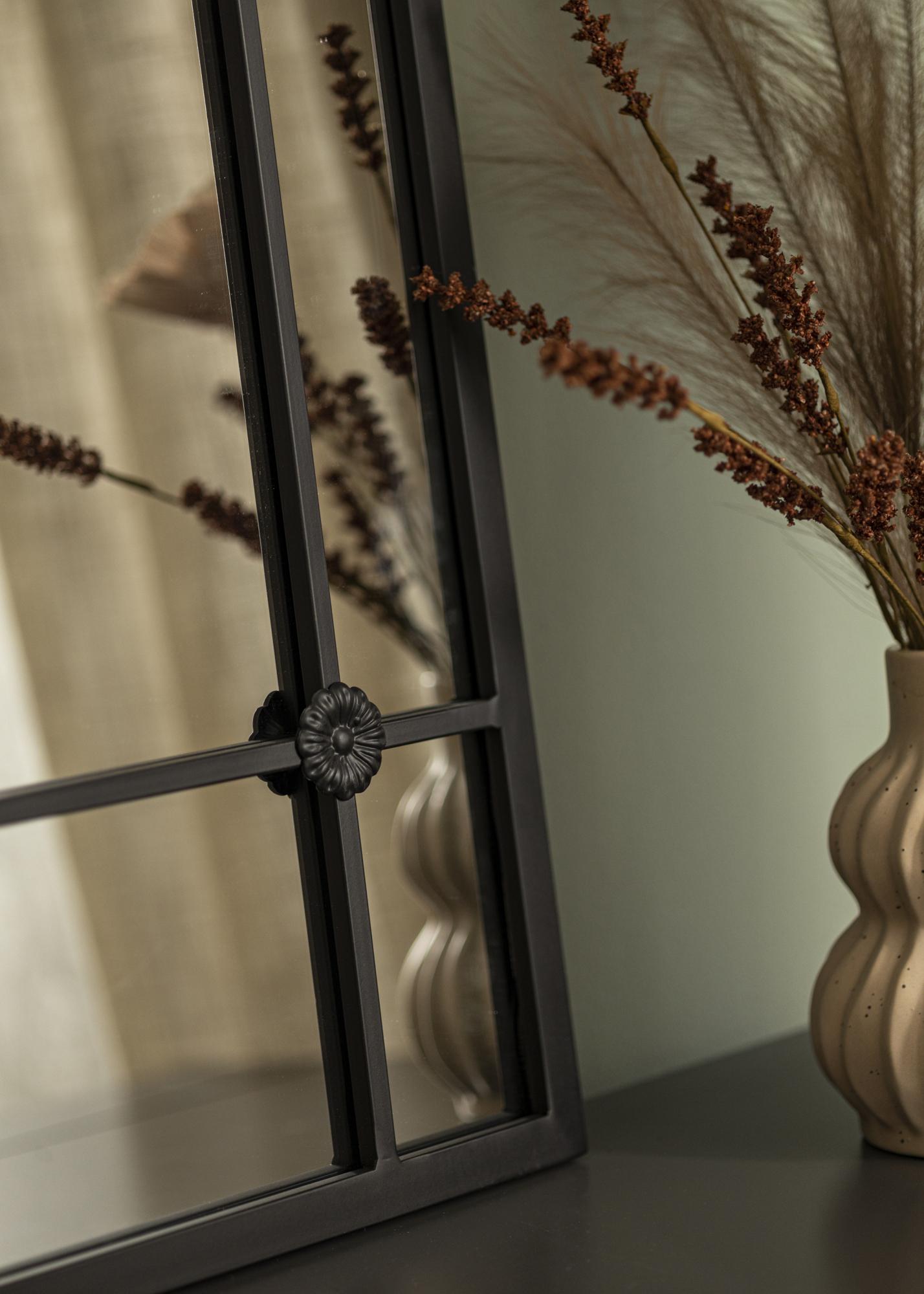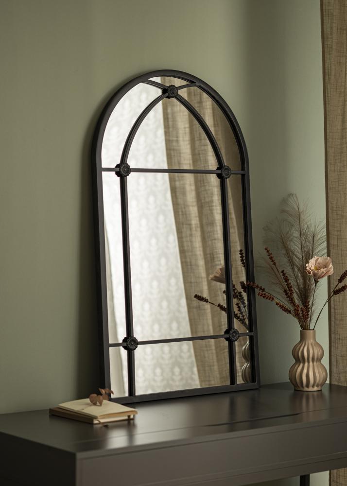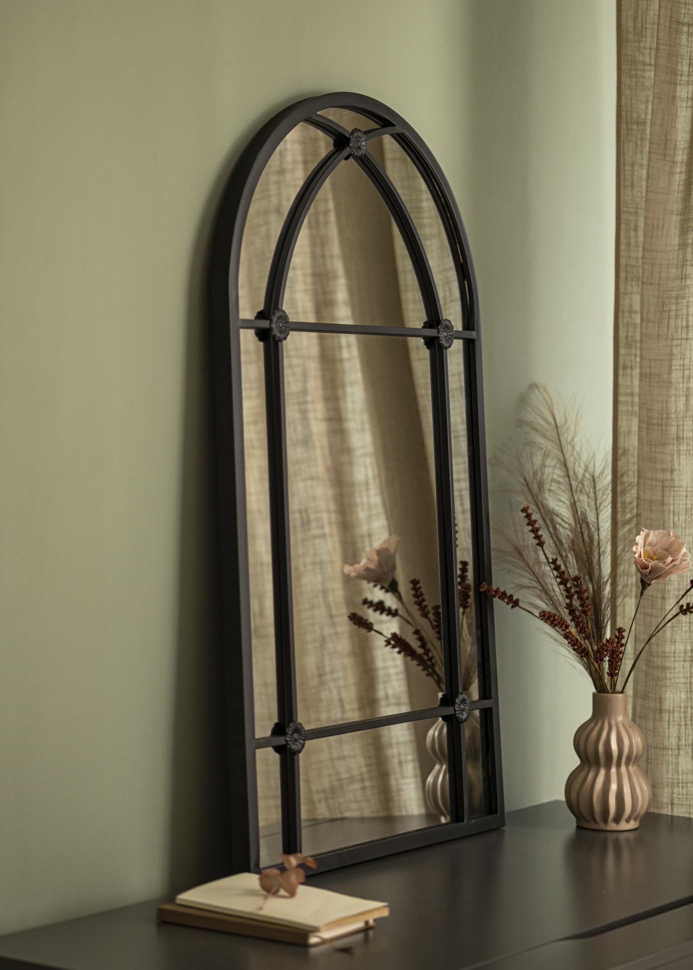 Със своята извита силуета и детайлна железна изработка, огледалото напомня на класически прозорци, които предават усещане за дълбочина и пространство в стаята. То е не само практичен предмет за ежедневна употреба, но и артистичен интериорен детайл, който привлича погледа и допринася за атмосферата на помещението.