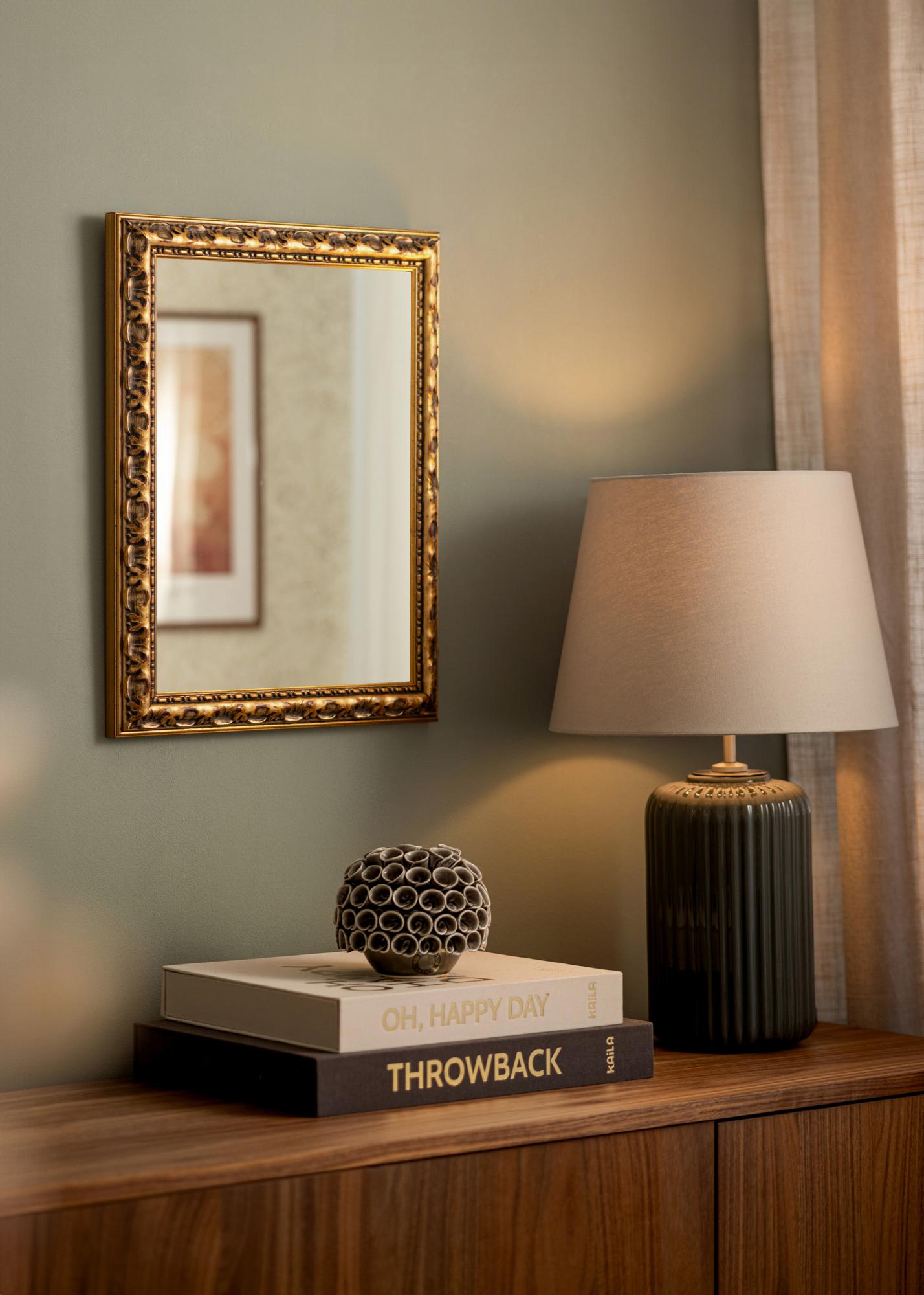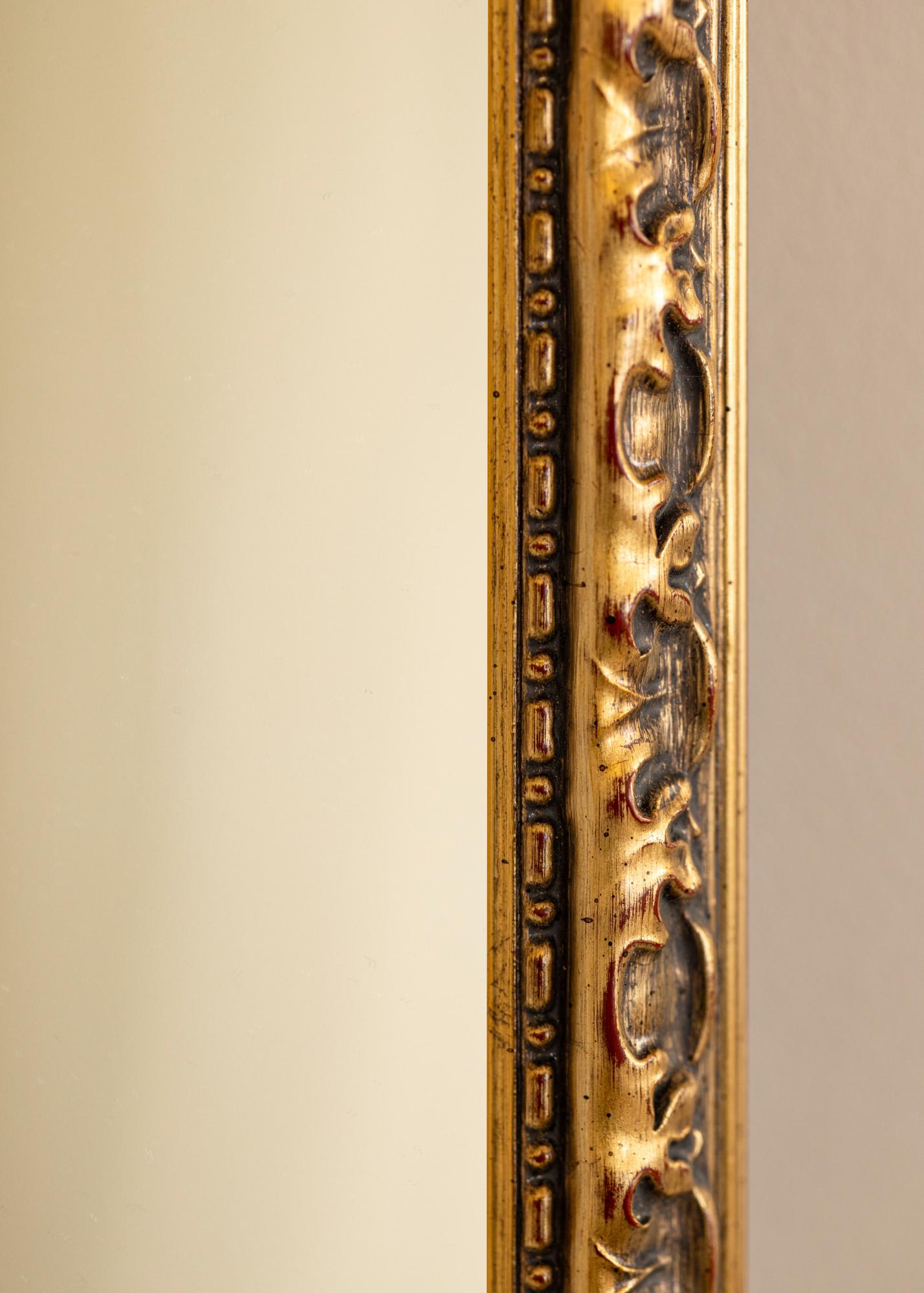 Рамката на Огледало Freyja Злато е 38 мм широка и има дълбочина от 34 мм, което придава на огледалото здрав и солиден усещане. Изработено от бор, то комбинира издръжливост с класическа естетика. Античният завършек с тъмни патинирани детайли и деликатни червени акценти подсилват рустикалния характер на огледалото и му придават вечна харизма.