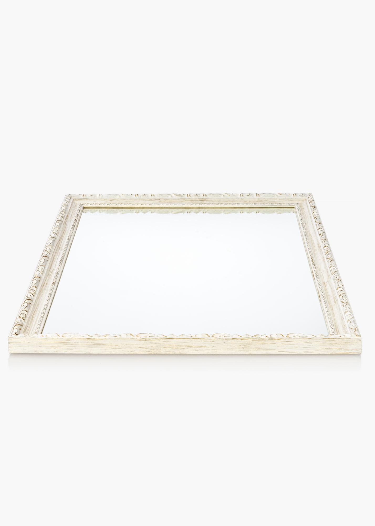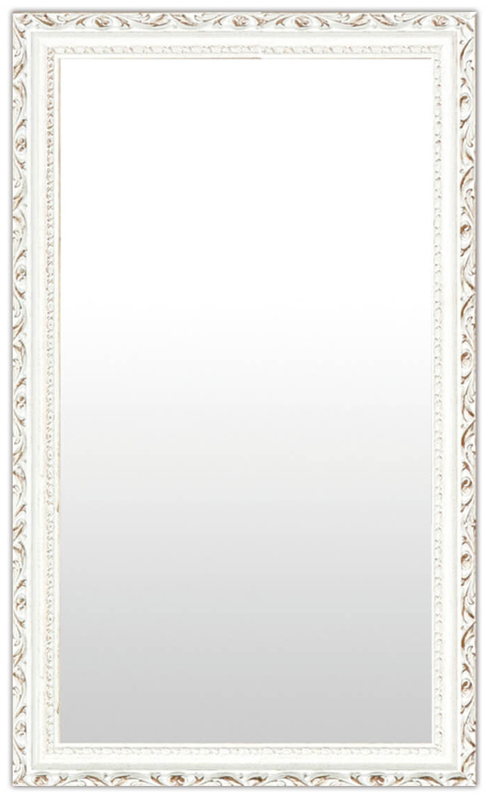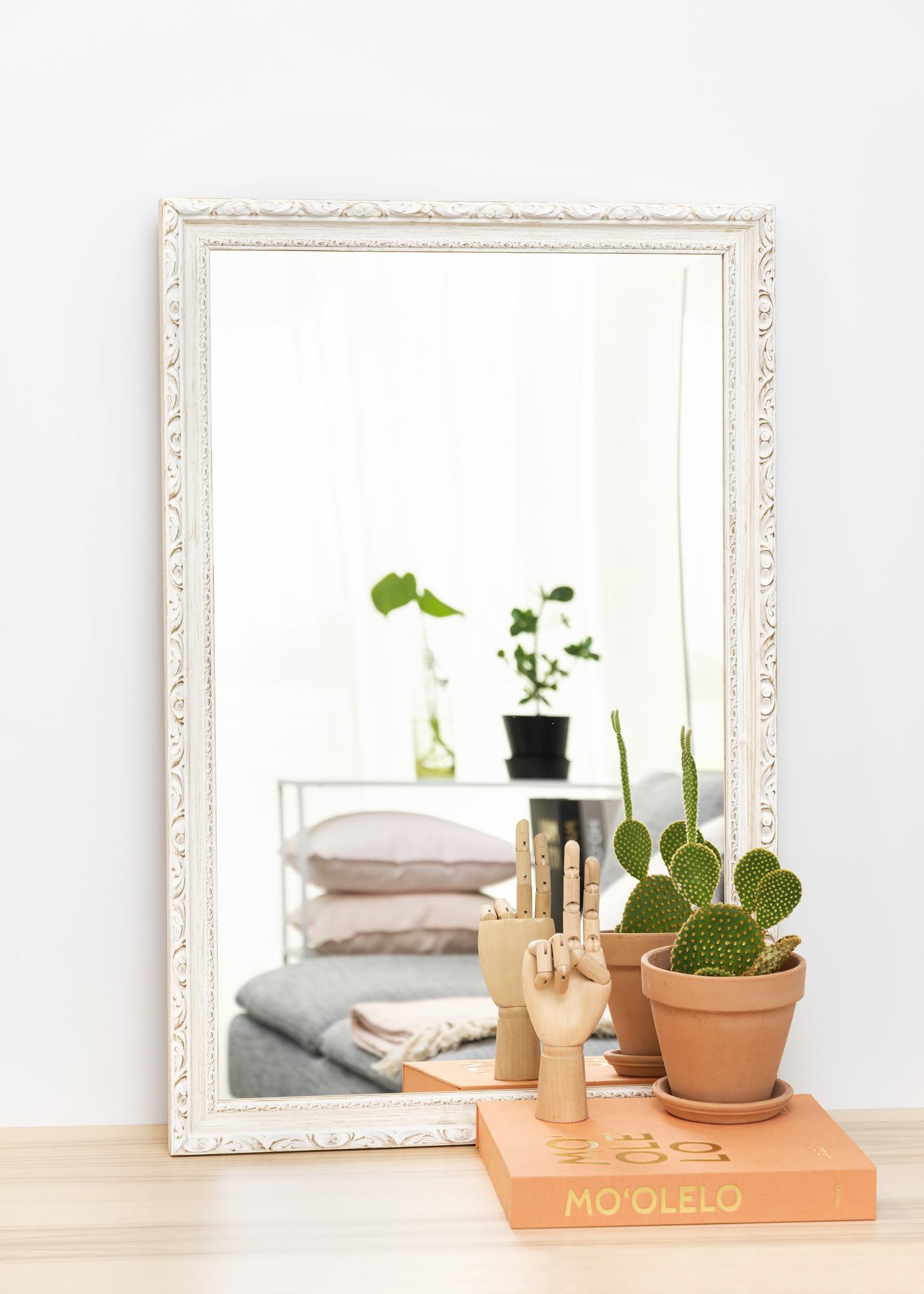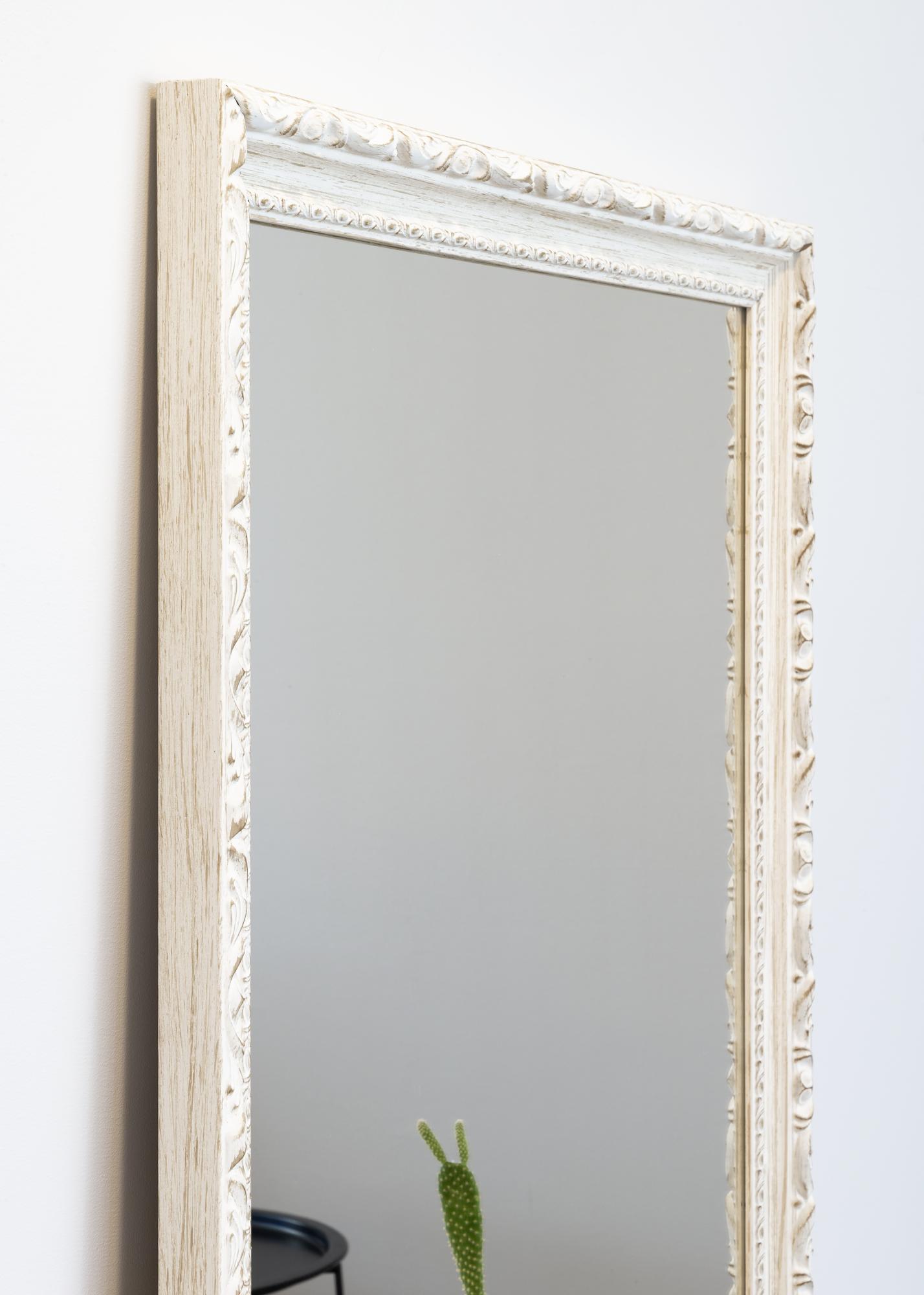 Бяло огледало в античен стил с видими дървесни нишки и ширина 40 мм. Отличен избор, когато търсите огледало, което се откроява и заема място.