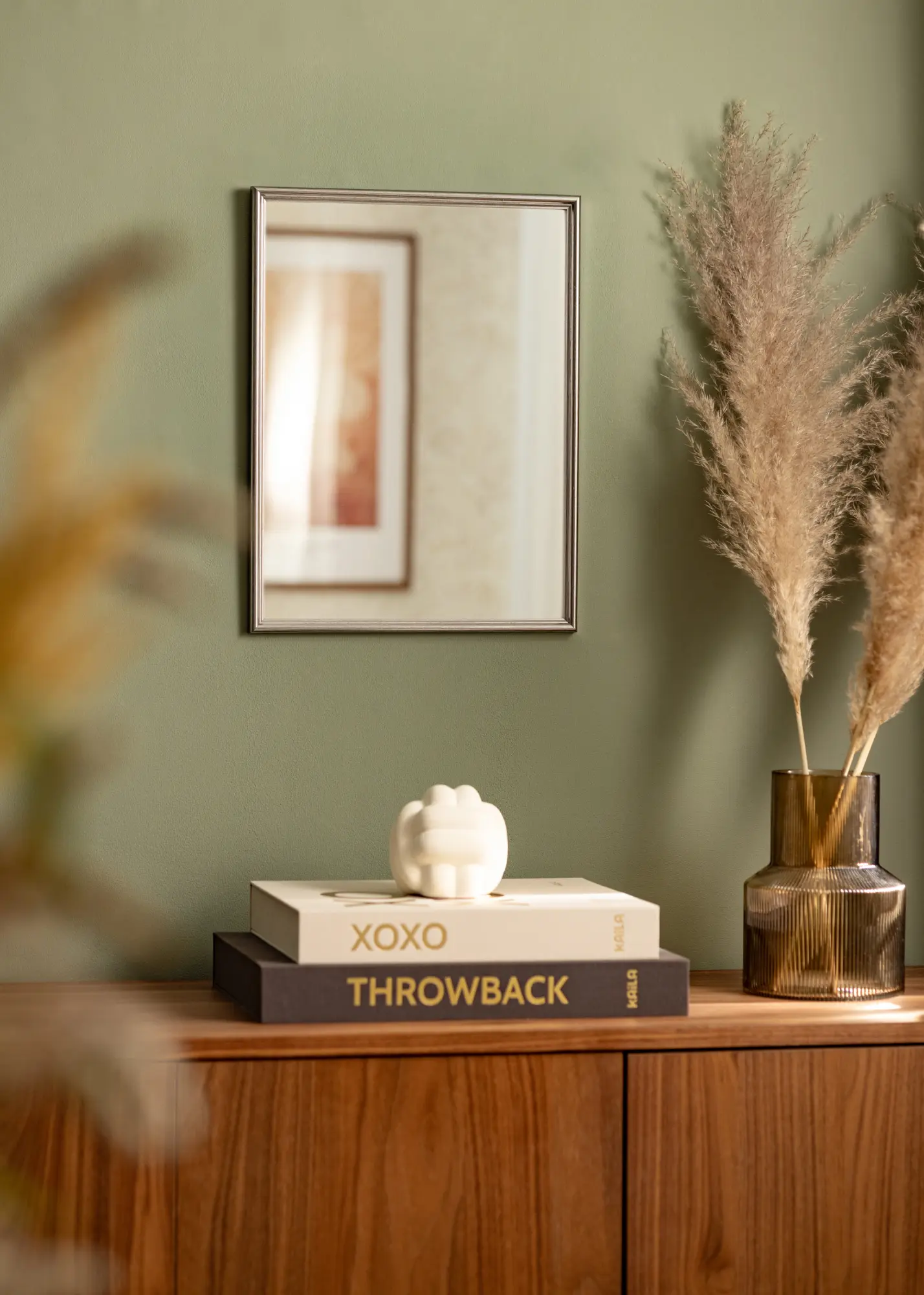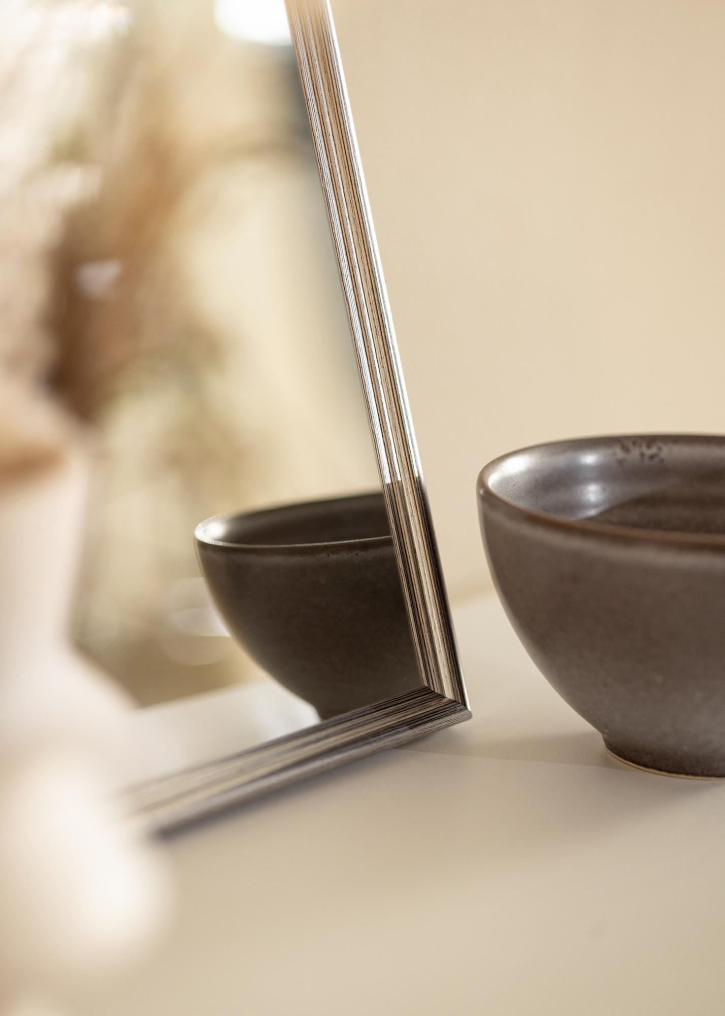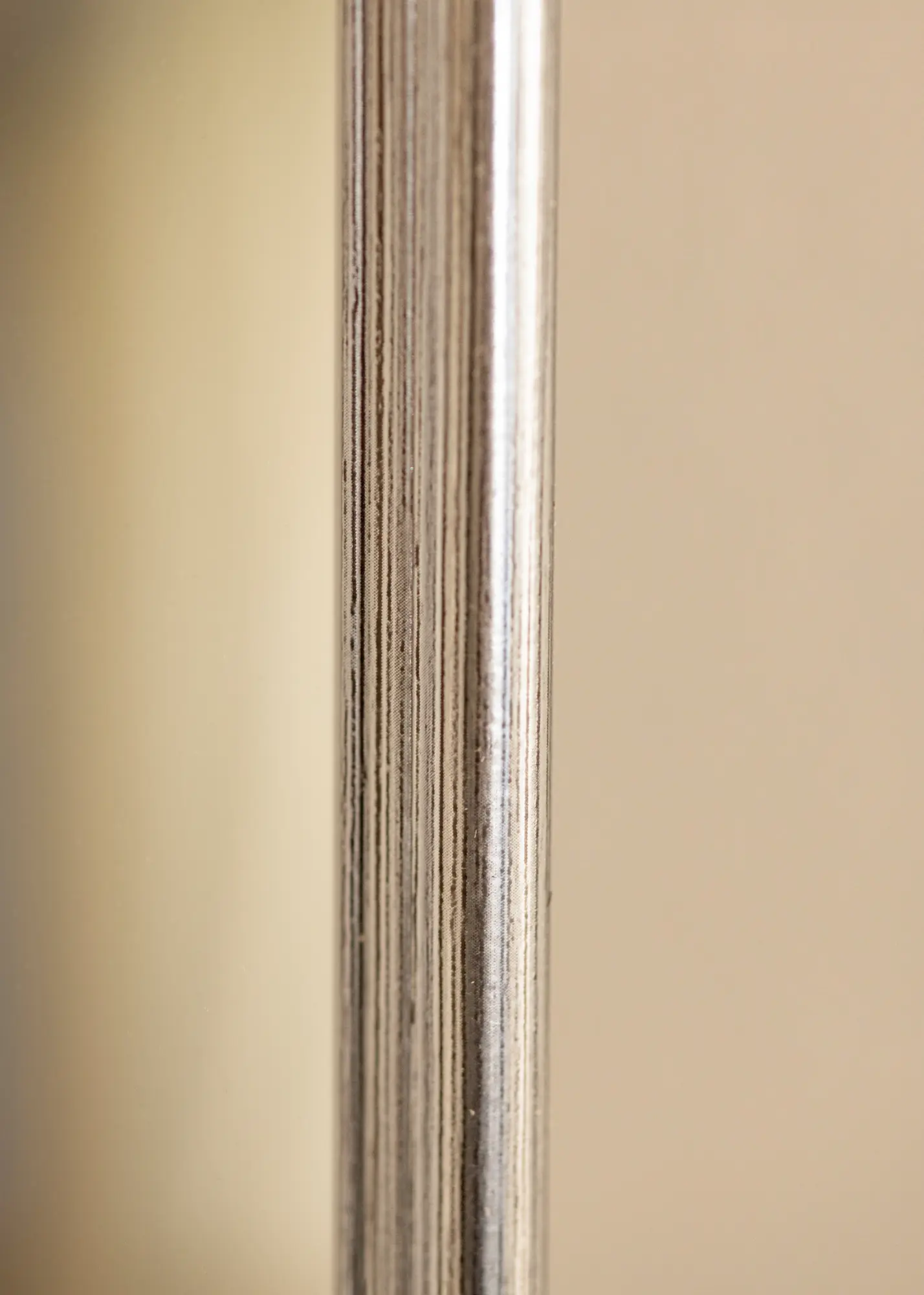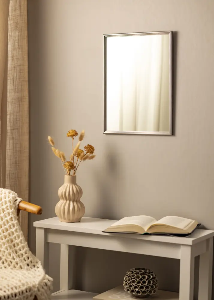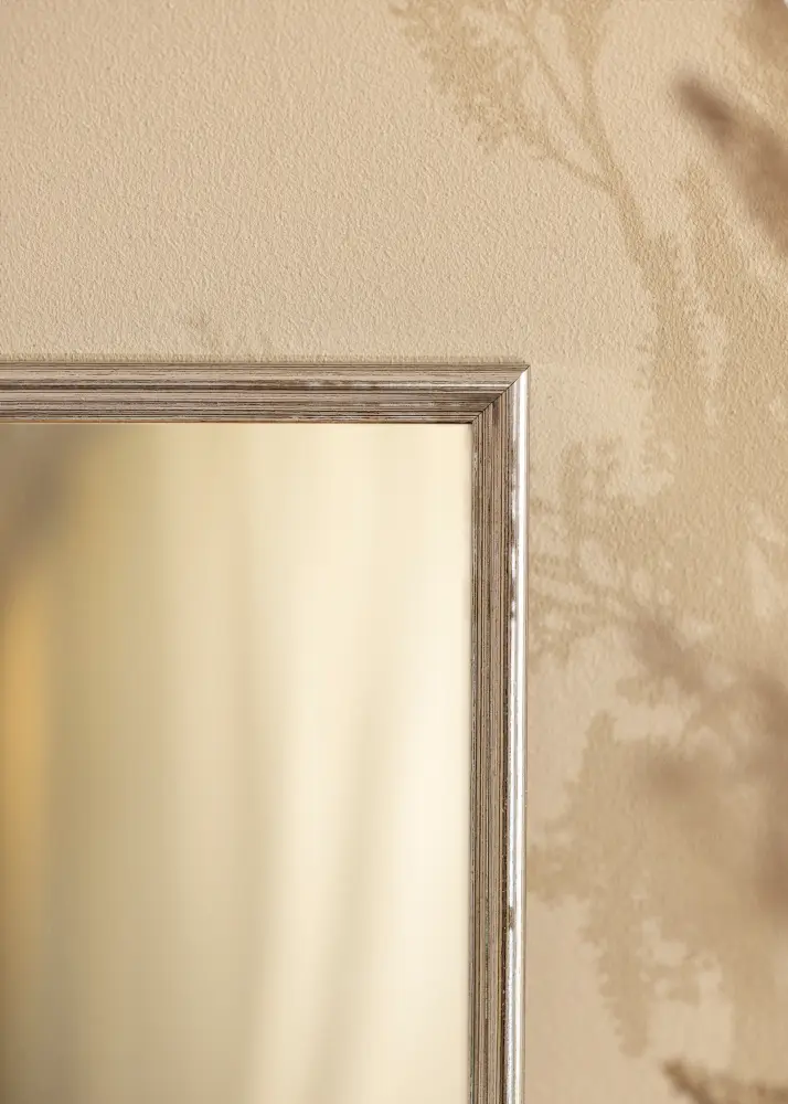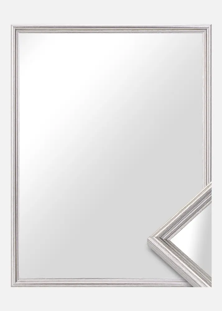 Нека изработим огледало, което пасва идеално на вашия дом! Това елегантно огледало се поръчва по вашите собствени измерения, така че можете да сте сигурни, че ще бъде точно. Огледалото има класическа профилирана рамка, боядисана с блестящо сребристо. Съчетава се добре с вътрешни компоненти в черно, бяло и лилаво, например.