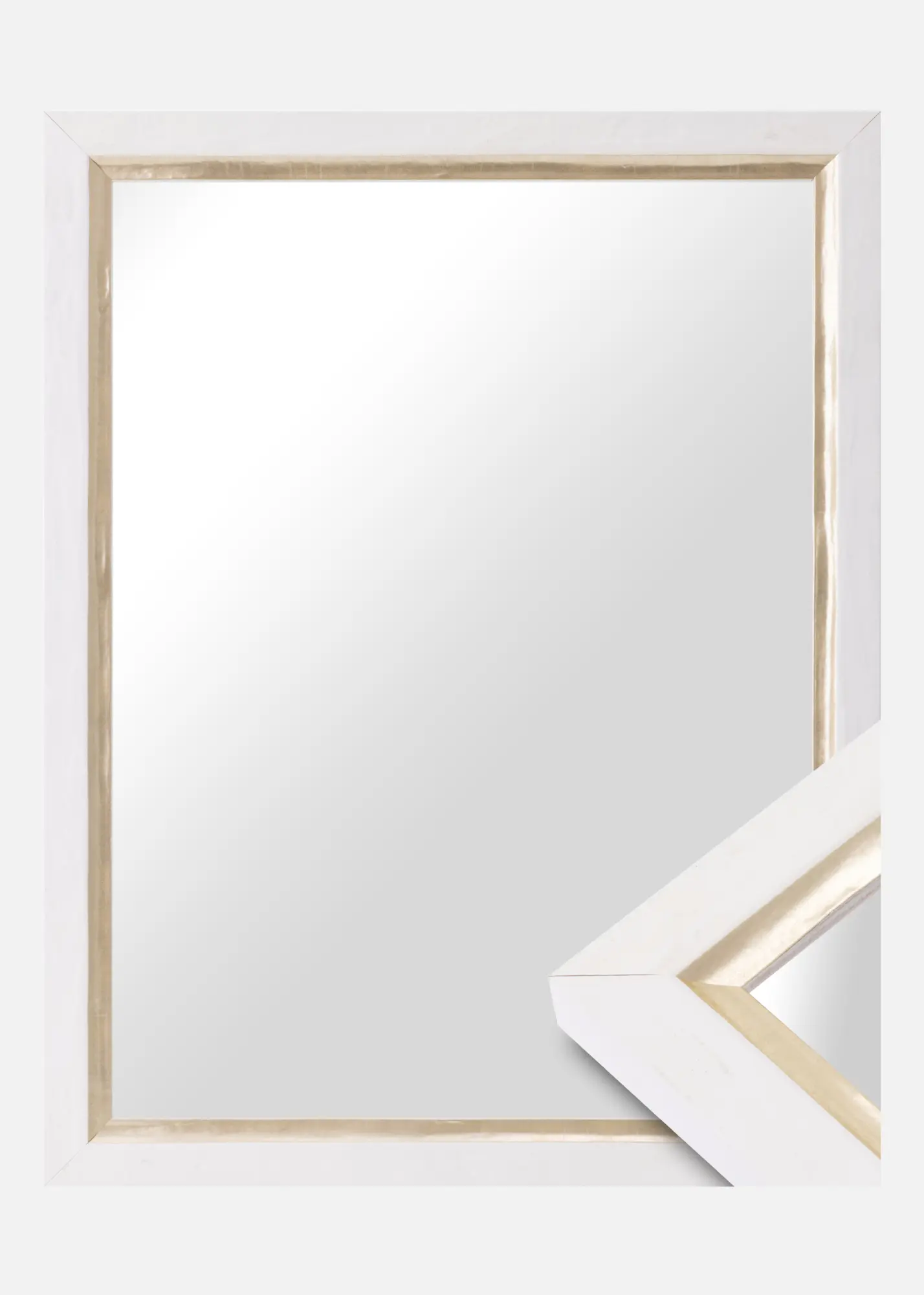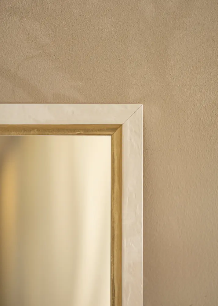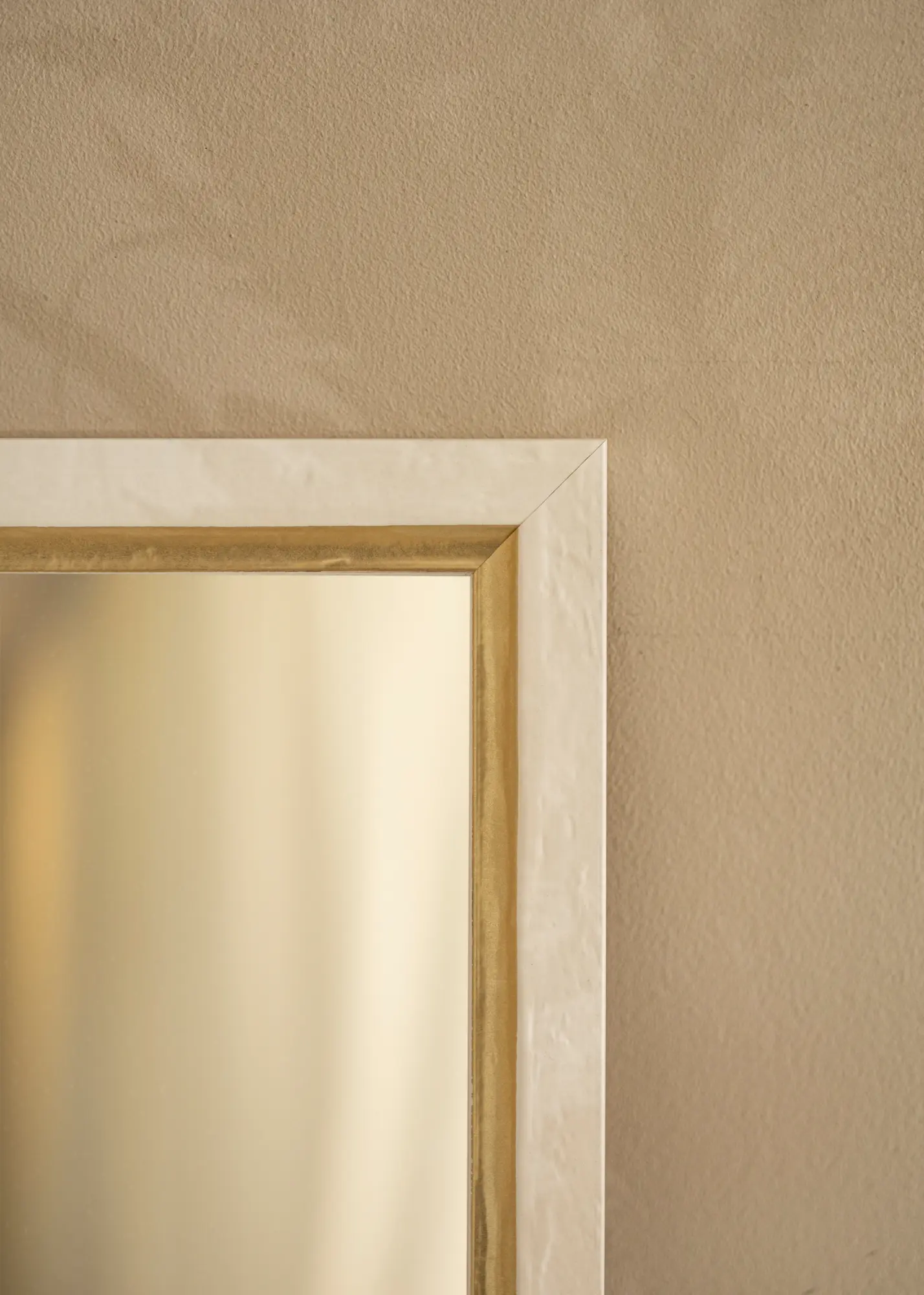 "Leonie" е широко огледало, произведено в Италия, което гарантира високо качество и стилен дизайн. Огледалото има елегантен бял профил с ясно структурирана повърхност и широка сребриста рамка, близо до огледалното стъкло.