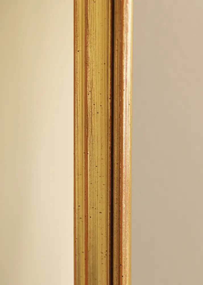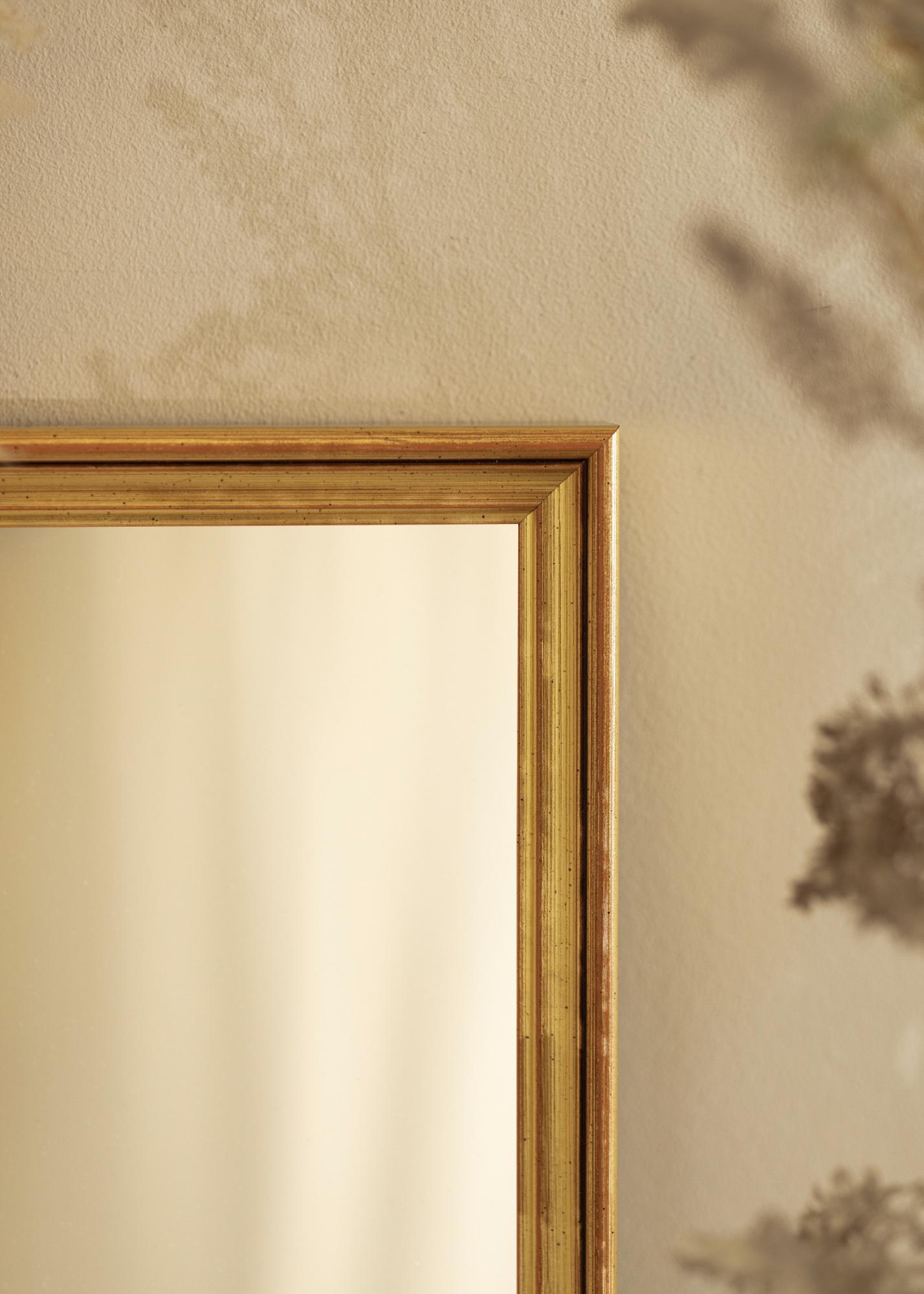 Това огледало има дълбочина от 39 мм, което придава усещане за устойчивост, без да е прекалено тежко или доминиращо. Изработено от бор, то комбинира здравина с лекота, което го прави лесно за монтиране на стената. Златистата повърхност има лек античен завършек с малки тъмни детайли, което създава вечен характер, подходящ както за модерни, така и за класически интериорни стилове.
