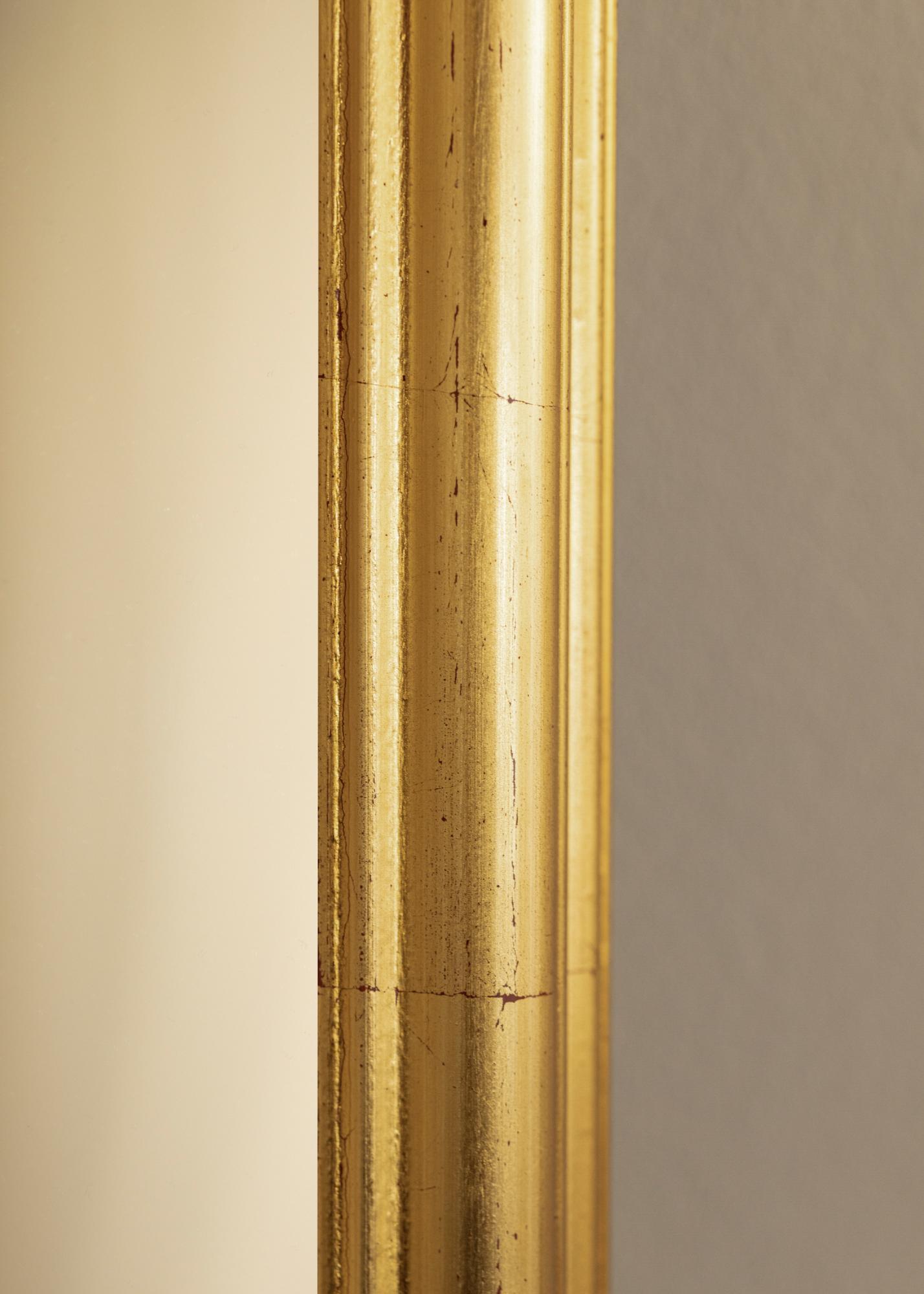 Рамката е изработена от айосс дърво и има меко извита профил, който допринася за изтънчения външен вид на огледалото. Повърхността е с антична патина със субтилни кракелажни ефекти и малки тъмни акценти, което придава на огледалото автентично винтидж усещане. Златното покритие създава топла и класическа атмосфера, идеална за да придаде на дома ви нотка от вечна елегантност.