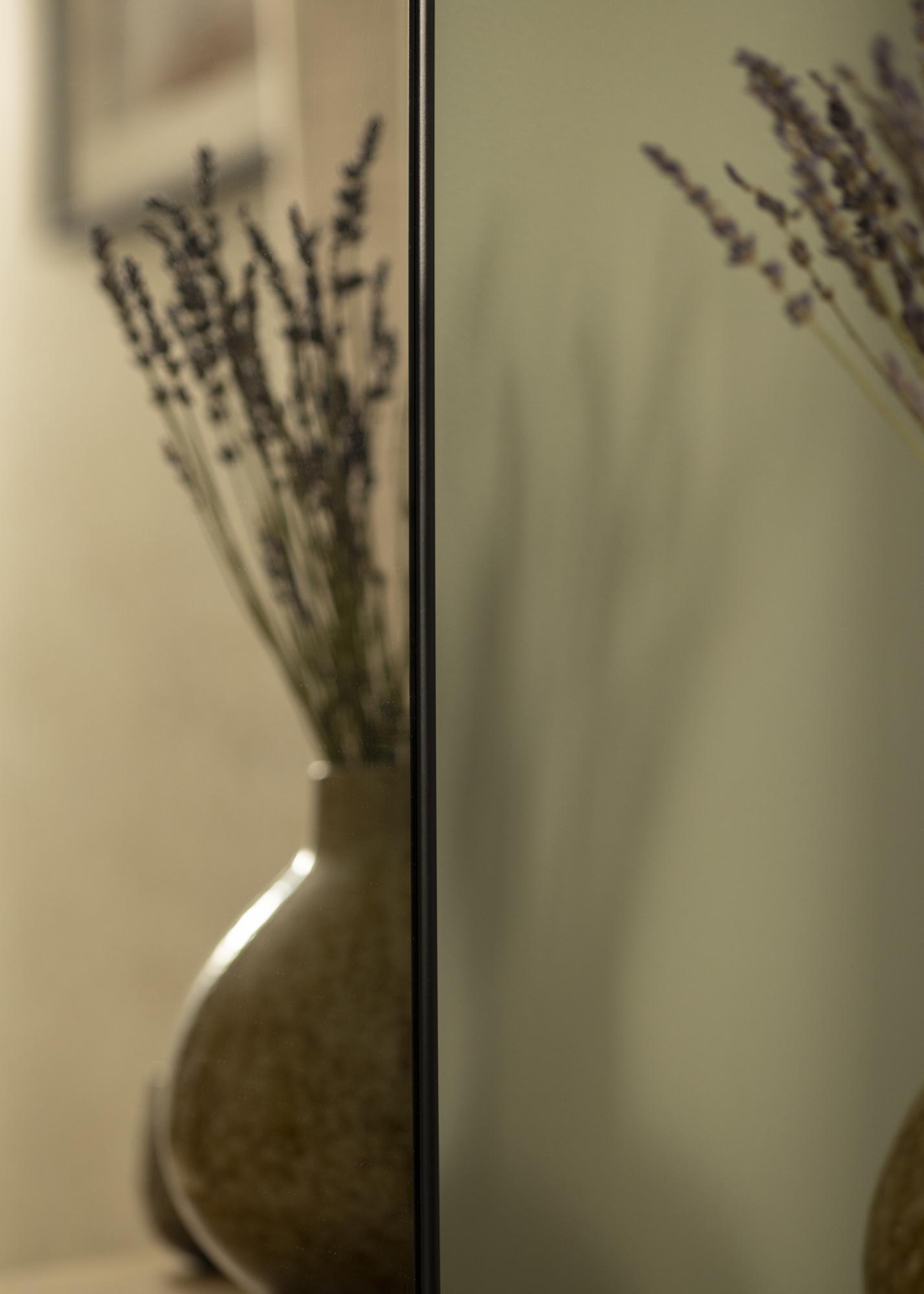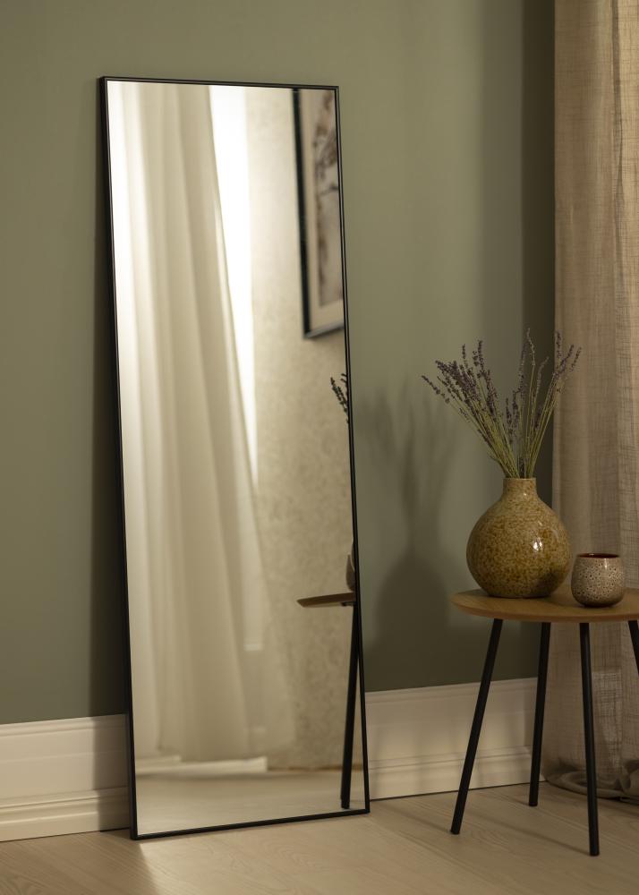 Това огледало е конструирано да се закача вертикално, което го прави отличен избор за спални, коридори или гардеробни, където вертикалното използване на пространството е ключът. Черната алуминиева рамка обхваща огледалното стъкло с фин, но все пак подчертаващ кант, който допълва множество интериорни стилове от модерен минимализъм до класически шик.