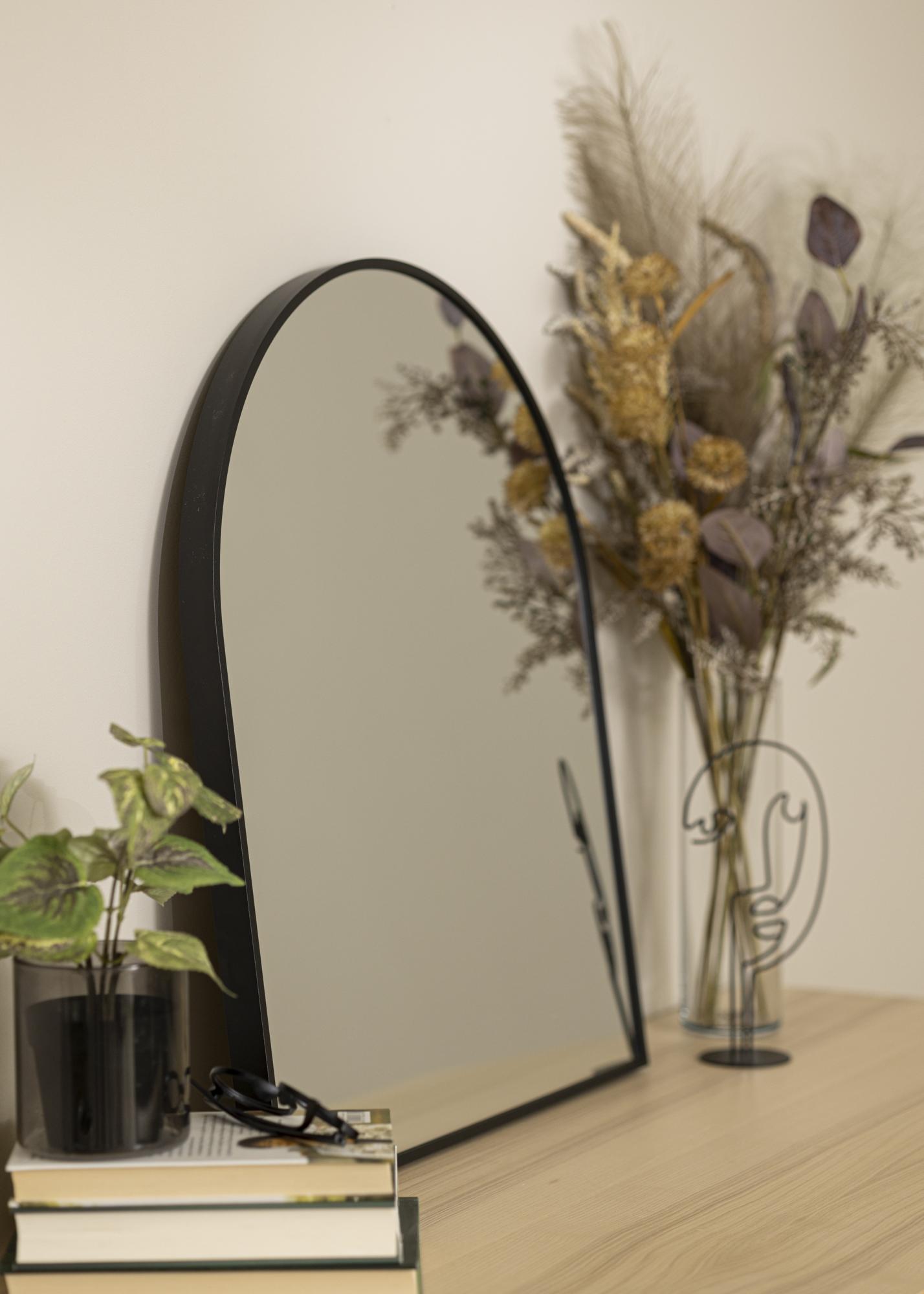 Това е отличен избор за вас, ако търсите огледало с модерен дизайн и стилна черна рамка с актуална аркообразна форма. Рамката на огледалото е с дълбочина 28 мм и е изработена от метал. Това огледало ще се превърне в очарователен декоративен елемент в коридора или хола, където ще отразява светлината от всички източници в стаята по красив начин. Здравият материал позволява използването му и в банята.