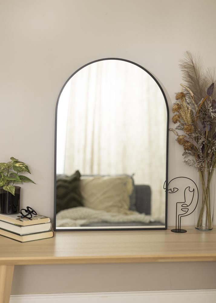 Това е отличен избор за вас, ако търсите огледало в модерен дизайн с модерен сводест дизайн и стилна черна рамка. Рамката на огледалото е 28 мм дълбока и е изработена от метал. Това огледало ще бъде очевиден декоративен детайл в антрето или всекидневната, където ще отразява светлината от всички източници на светлина в стаята по красив начин. Здравият материал прави възможно използването му и в банята.