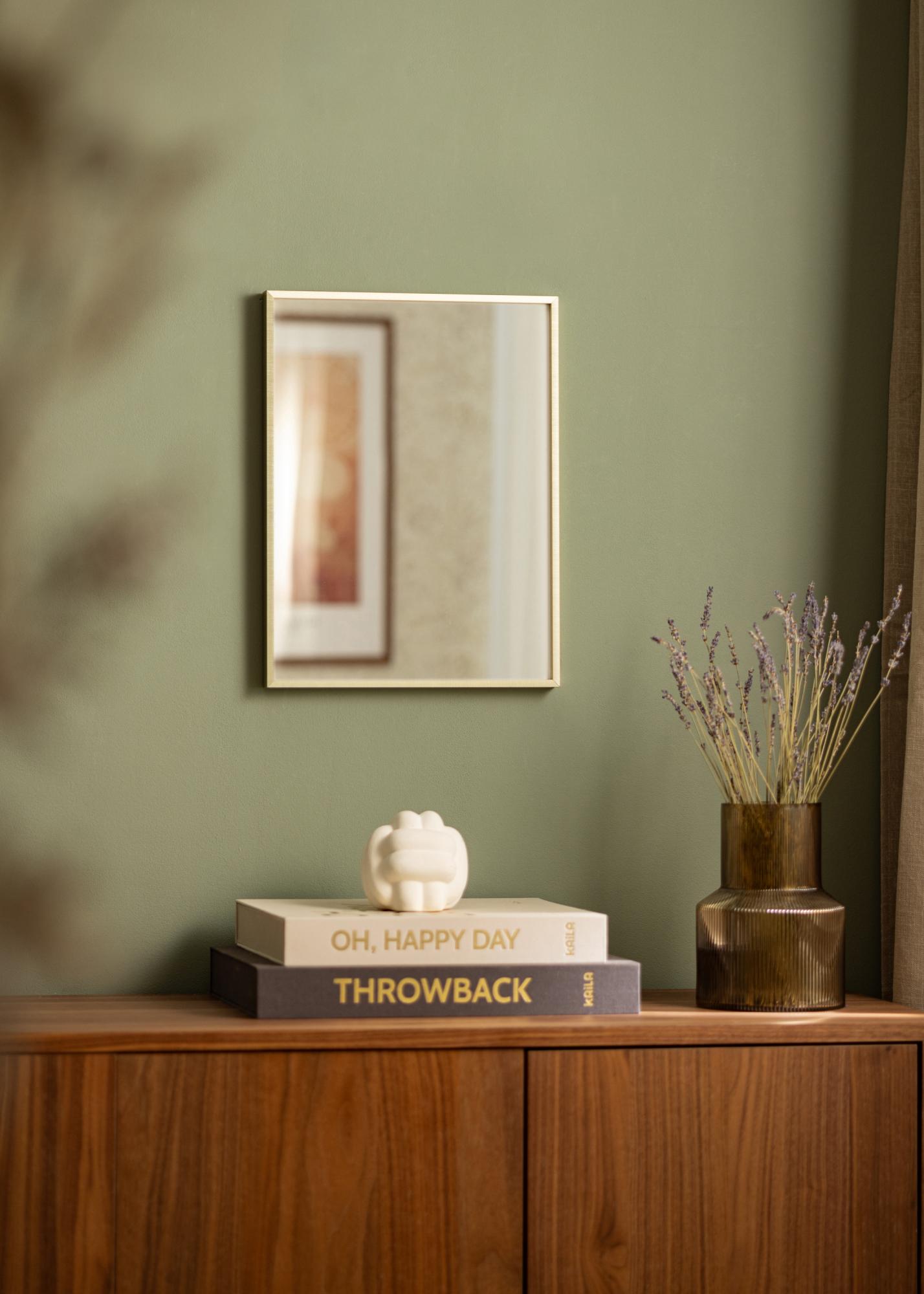 Рамката на това огледало е 7,8 мм широка и има дълбочина от 25,9 мм, което й придава здраво и стабилно усещане. Изработена от алуминий, съчетава издръжливост с лека тежест, което я прави лесна за монтиране на стената. Четката златисто покритие придава модерен и изискан вид, който се вписва както в класически, така и в модерни интериорни стилове.