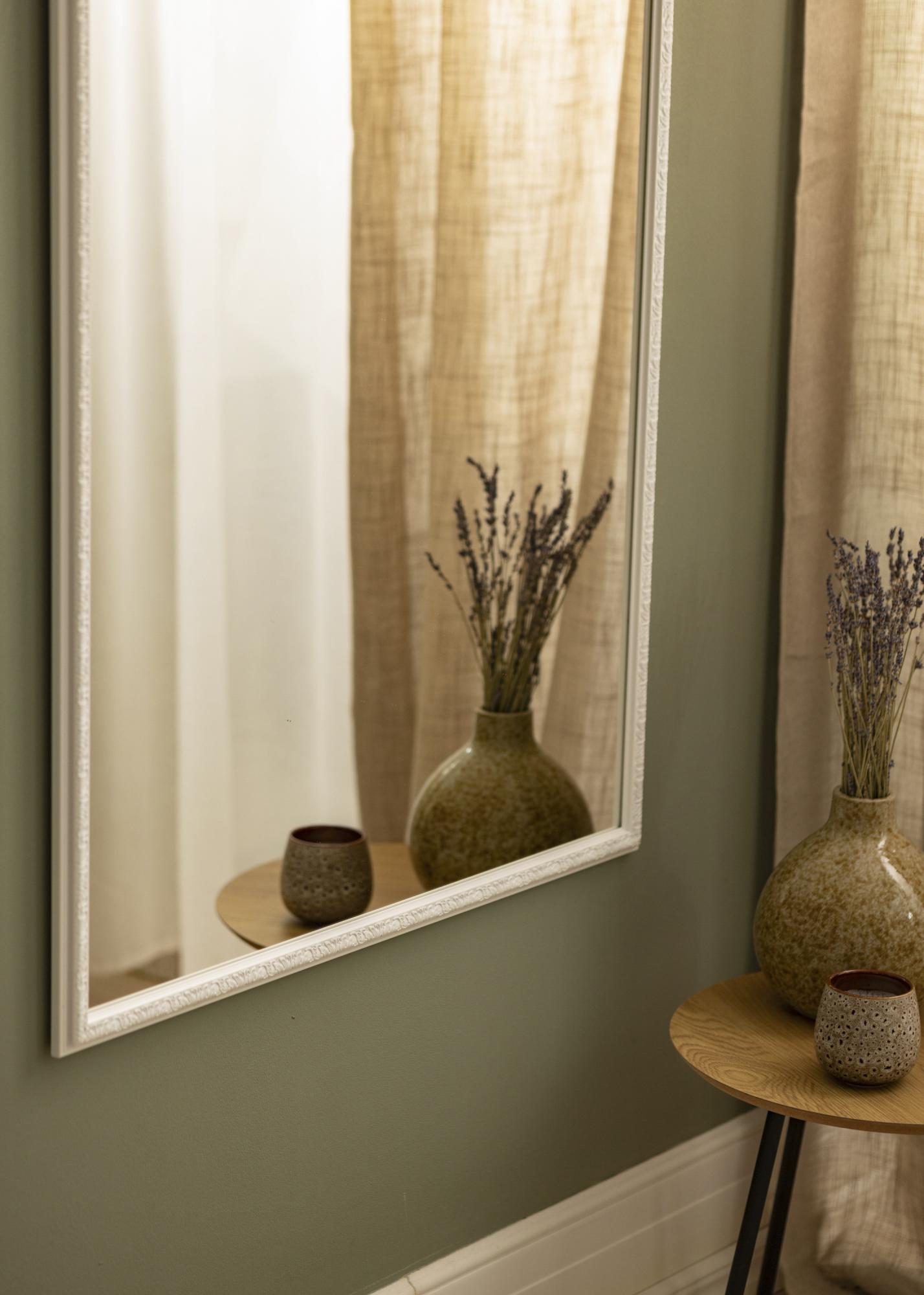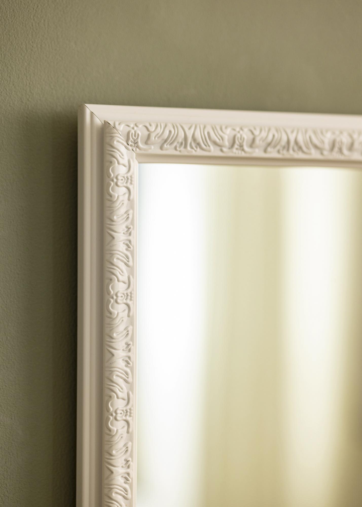 Това огледало за стена е стилен елемент от интериора, който красиво отразява светлината от всички източници на осветление в стаята. Бялата рамка придава свежо и светло усещане, което е перфектно допълнено от декоративния профил и красиви мотиви на рамката.