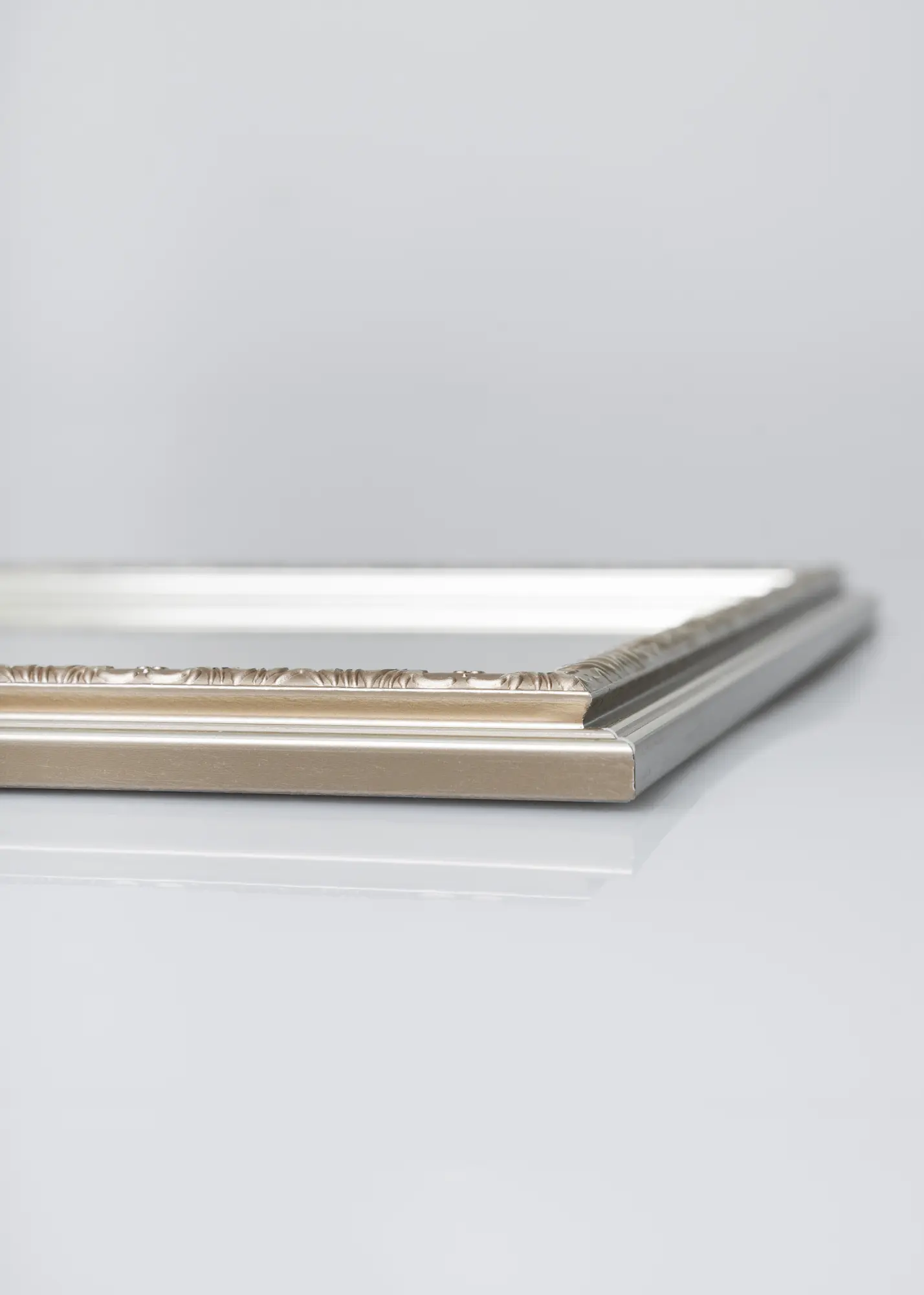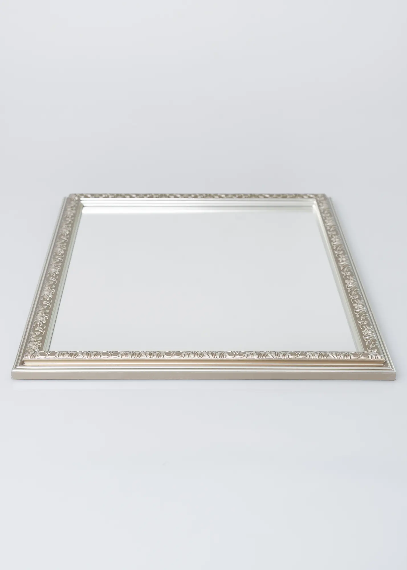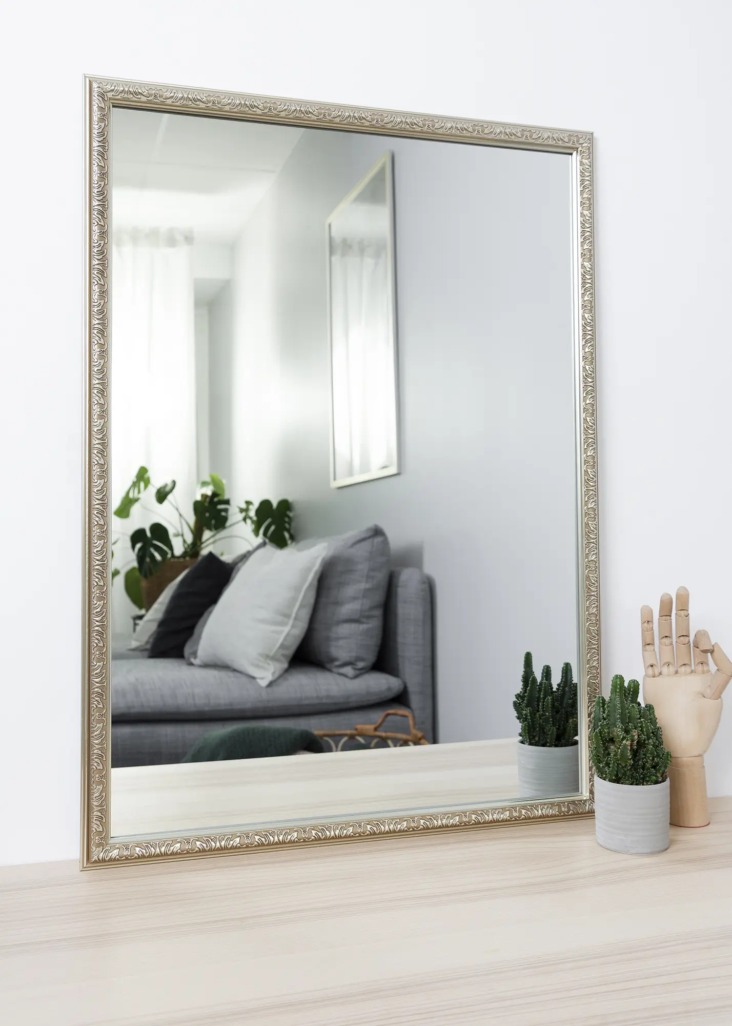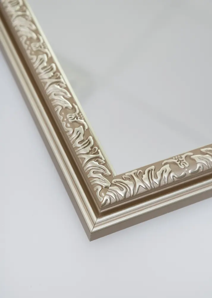 Стартирайте избора на рамка »Nost Silver се нарича серия стенни огледала. Рамката е обилно украсена с неправилни символи, които създават малко мистериозно впечатление.