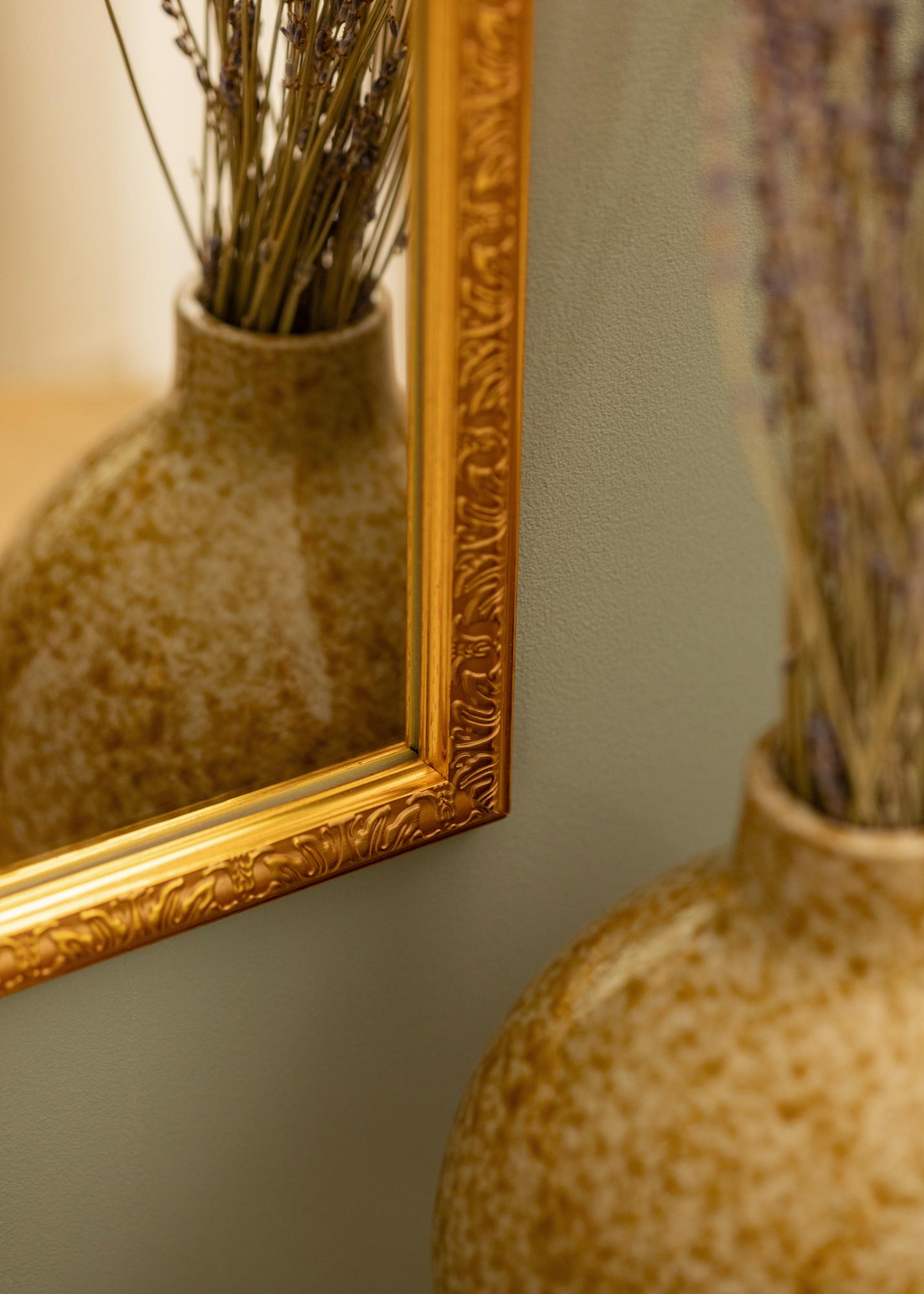Търсите ли луксозно огледало в златист цвят? Можете да спрете да търсите сега. Nostalgia злато е стенен огледало с 2,8 см широка рамка с елегантен профил и красив декоративен мотив. Огледалното стъкло ще отразява светлината в стаята ви, докато самото огледало ще стане стилен акцент на стената ви. На гърба има стенен монтаж за по-лесно окачване.