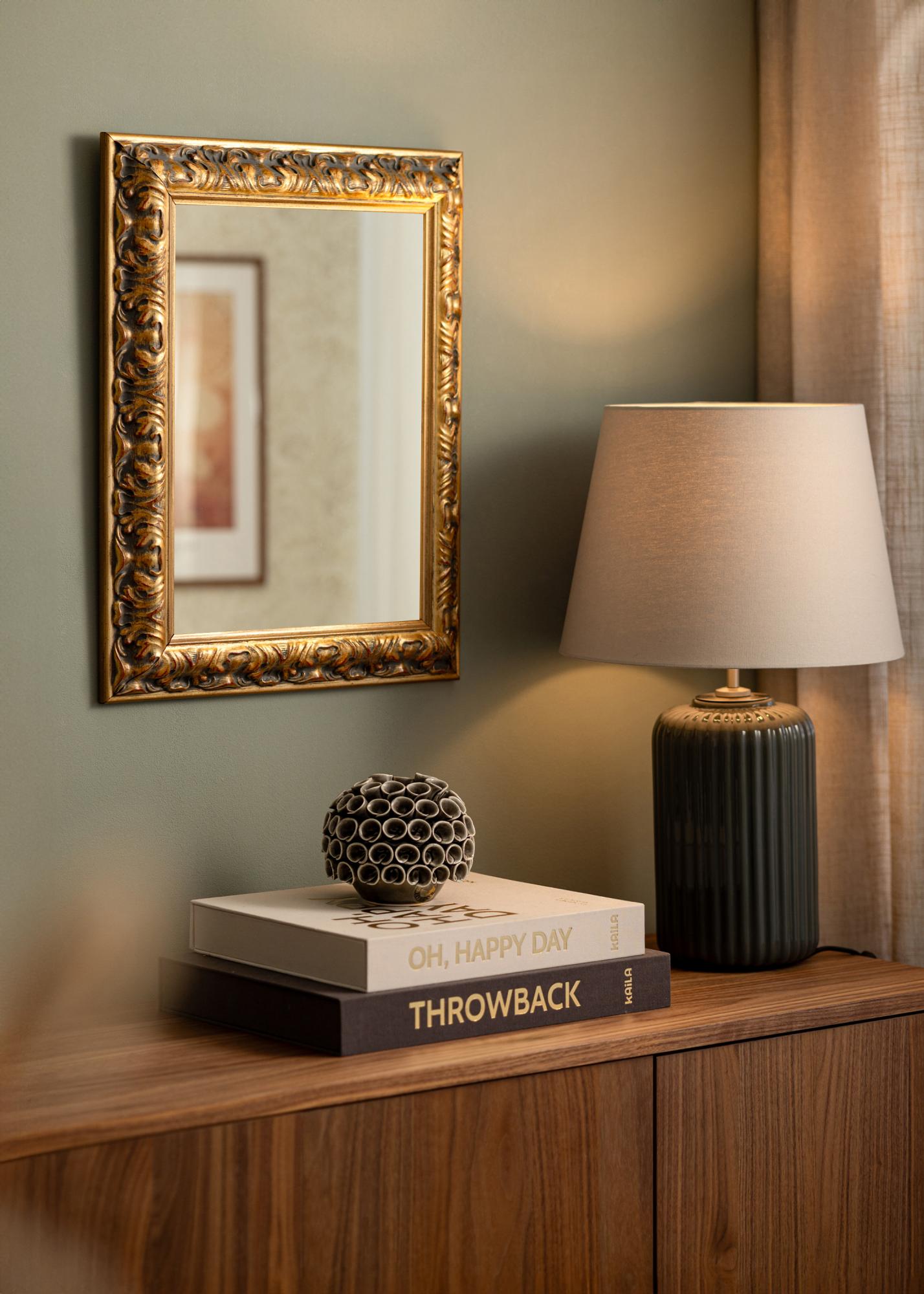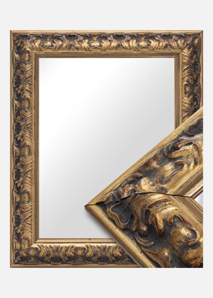 Огледало Odin Злато/Червено е елегантно и стилно огледало, което се изработва според вашите собствени размери. Смускулената си златна рамка и антична патина, то става впечатляващ елемент във всяко помещение. Рамката, която е с широчина 64 мм и дълбочина 38,5 мм, е изработена от бор и украсена с детайли в бароков стил. Скулптурните релефни мотиви придават на огледалото уникален характер и се подчертават от деликатен контраст между злато и тъмни акценти.