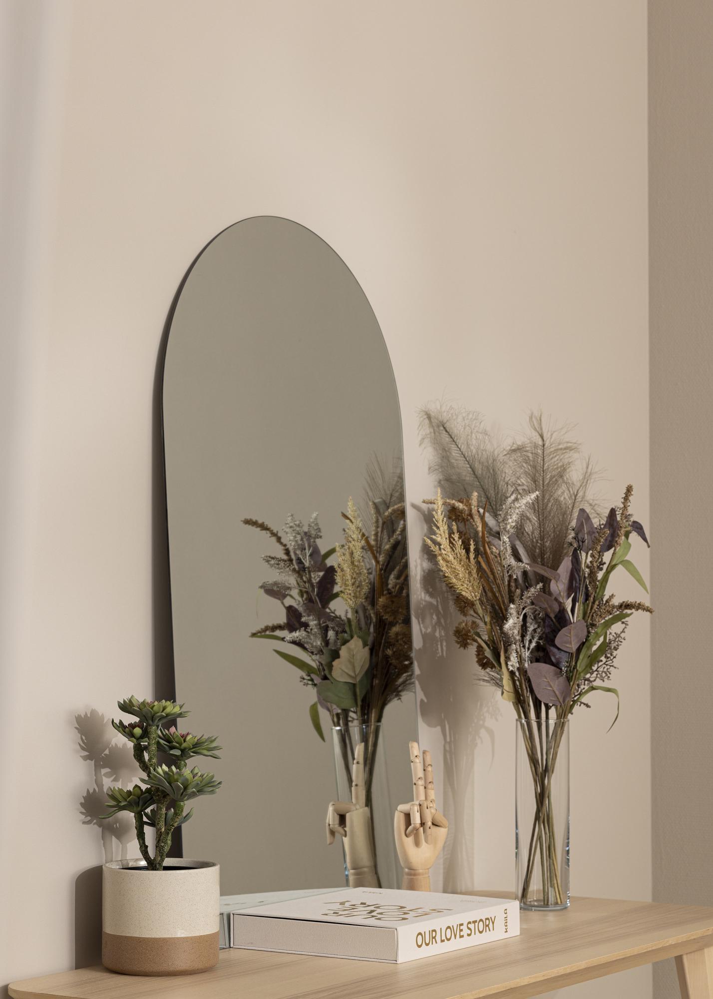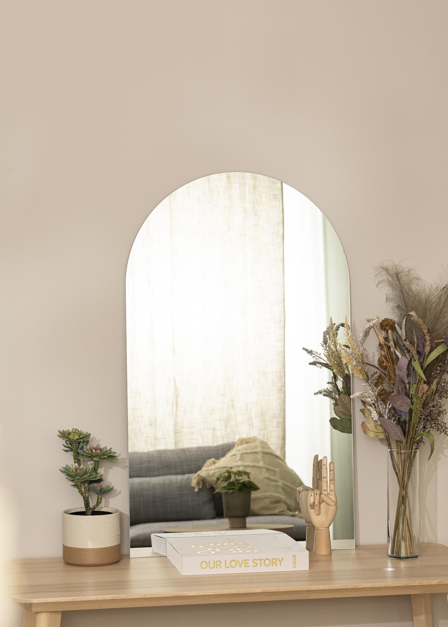 Това е много елегантно огледало с тънко огледално стъкло и класически арковид дизайн. Огледалото няма рамка, което му придава минималистичен вид. Това стеново огледало има захващания за стена отзад за по-лесен монтаж в стаята, която желаете.