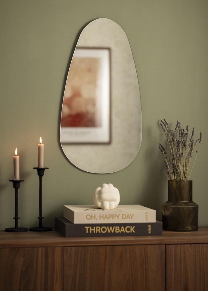 Това огледало не е само практичен детайл, но и декоративен елемент, който допълва вашия интериор. Неговата елегантна силует с форма на капка нежно се разширява нагоре, създавайки усещане за спокойствие и красота в стаята. То е проектирано да се окачва както в изправено, така и в легнало положение, което ви дава гъвкавостта да го приспособите към вашето пространство и личен стил.