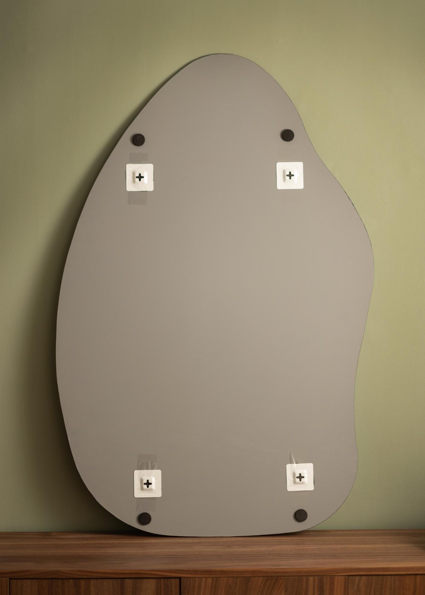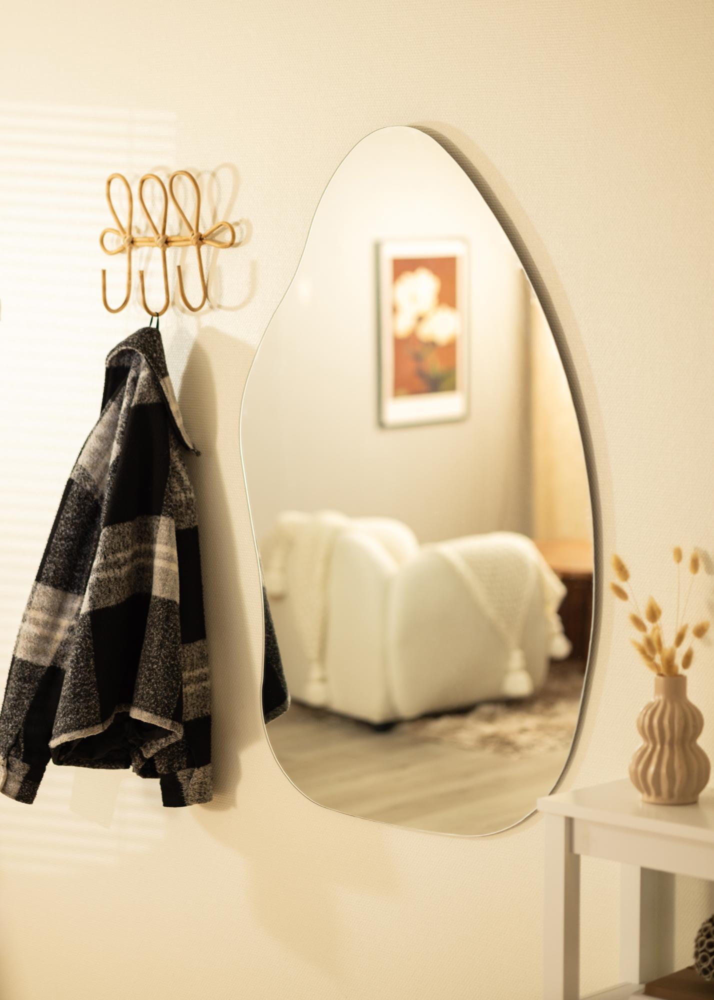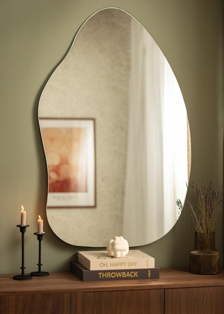 Огледалото има мека и органична форма, която напомня за капка вода или стоящо листо, придавайки елегантно и модерно усещане на стаята. Тази уникална форма превръща огледалото в начало на разговор и произведение на изкуството, като същевременно изпълнява своята практическа функция.