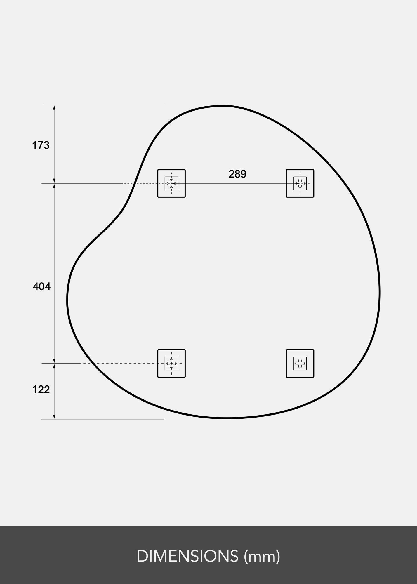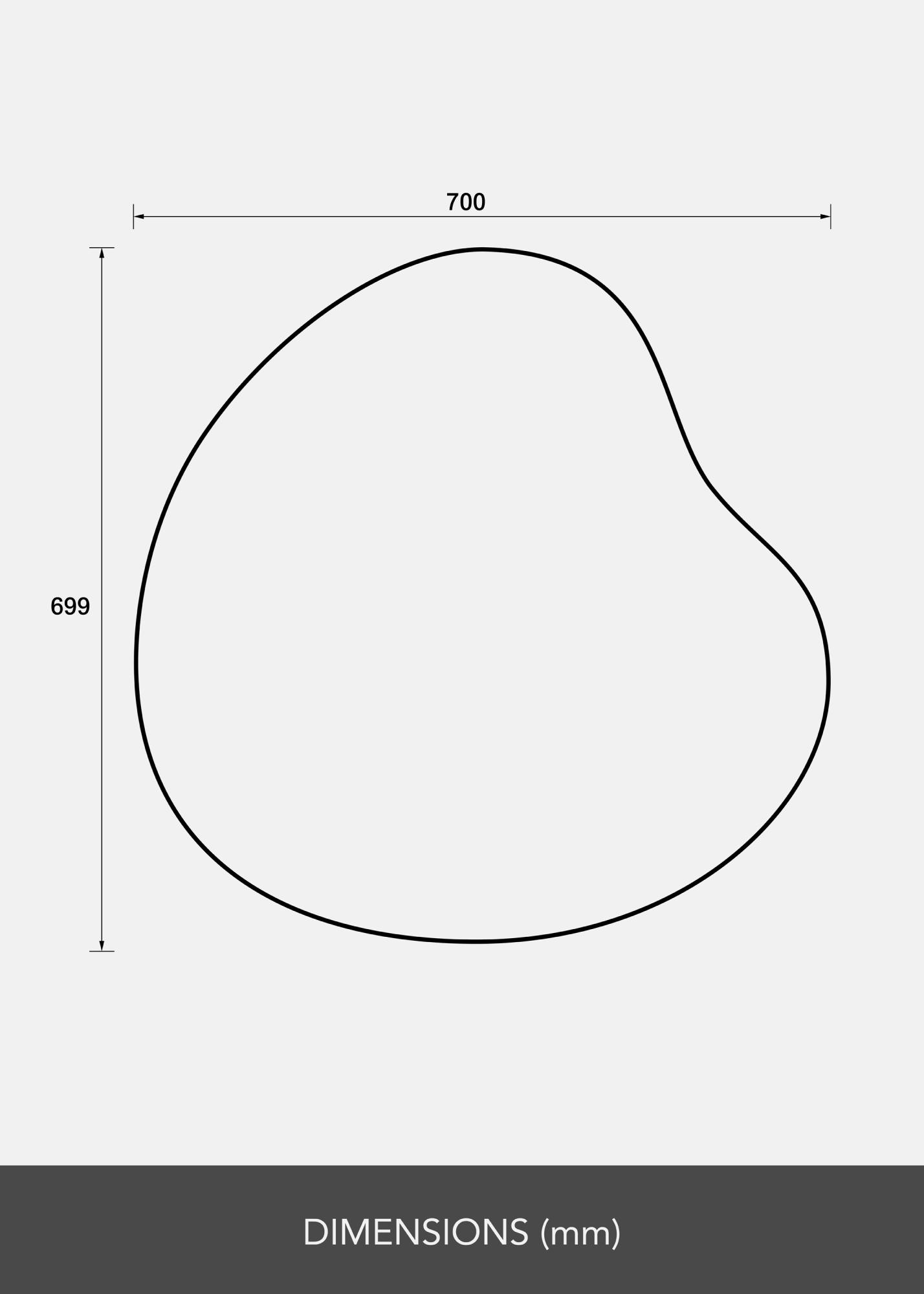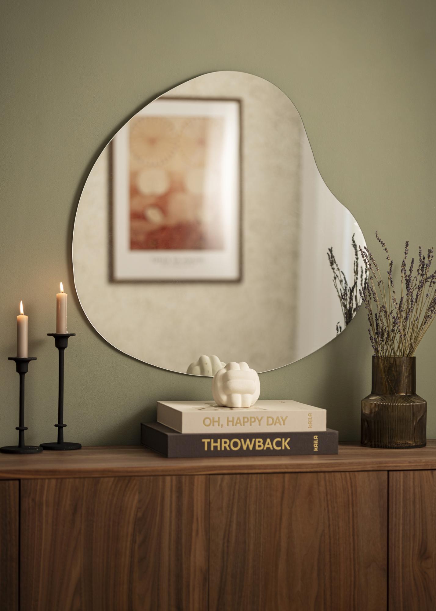Огледалото има меко очертана, асиметрична форма, която грациозно извива и придава усещане за движение и мекота. Този дизайн прави огледалото артистична детайл на стената, като същевременно запазва неговата практическа функция.