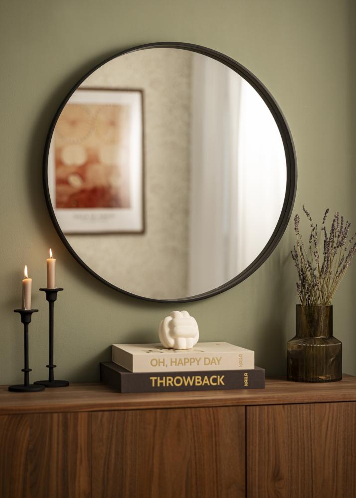 Открийте елегантната простота на нашето кръгло огледало, една вечна декоративна част, която пасва перфектно във всеки дом. Това стилно кръгло огледало се откроява със своята черна рамка, която придава свежо и модерно усещане на стаята. Неговият минималистичен дизайн му позволява да се вписва както в класически, така и в съвременни среди, и да се превърне в забележителен акцент на стената.