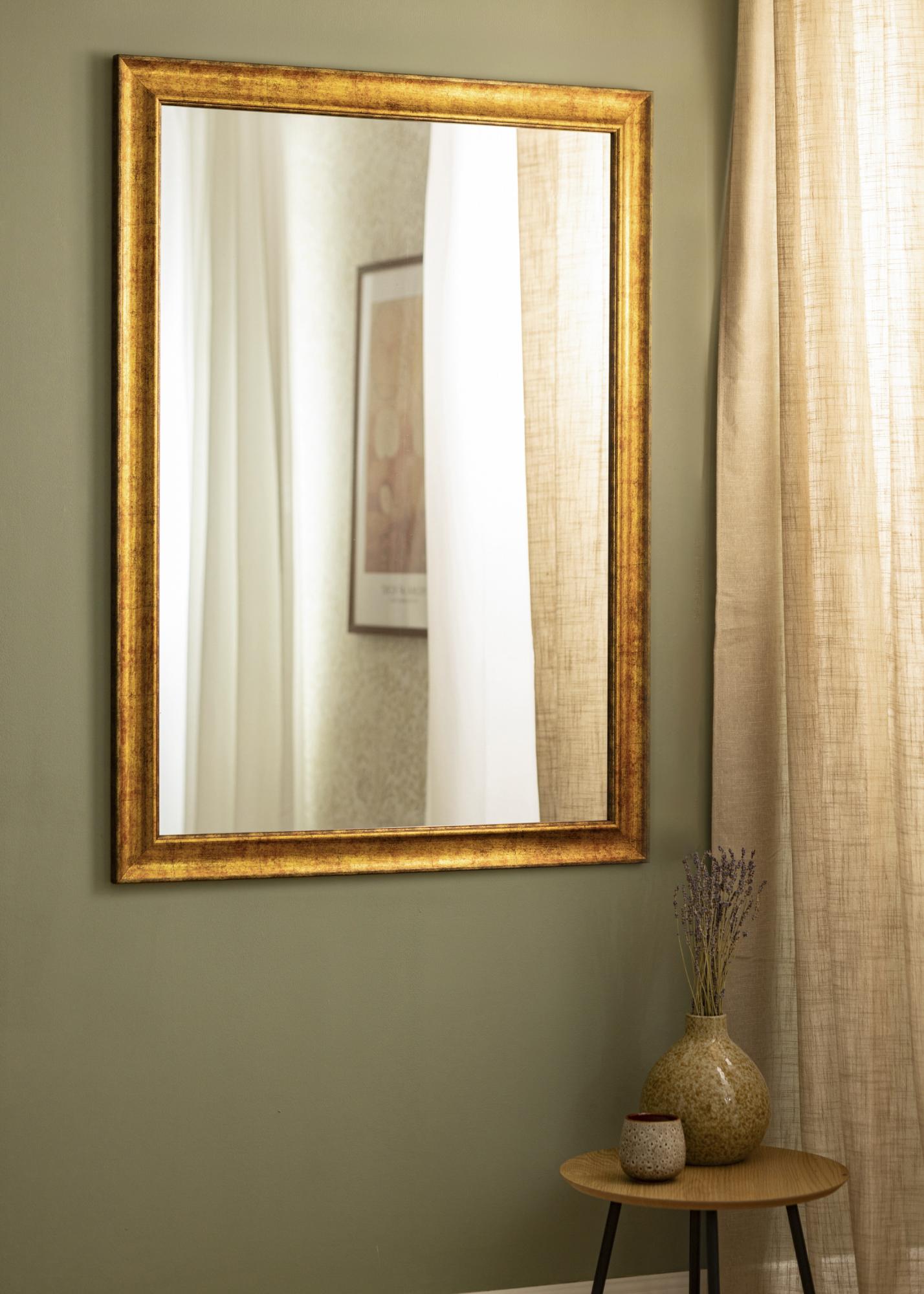 Това красиво стеннозеркало има декоративна златна рамка, изработена от композитен материал. Рамката има елегантен "износен" вид, който придава на огледалото по-стар израз, който се вписва отлично в топли и уютни домове. Практичното окачване на задната страна ви позволява да окачите огледалото както вертикално, така и хоризонтално. Това огледало измерва 70x100 см.
