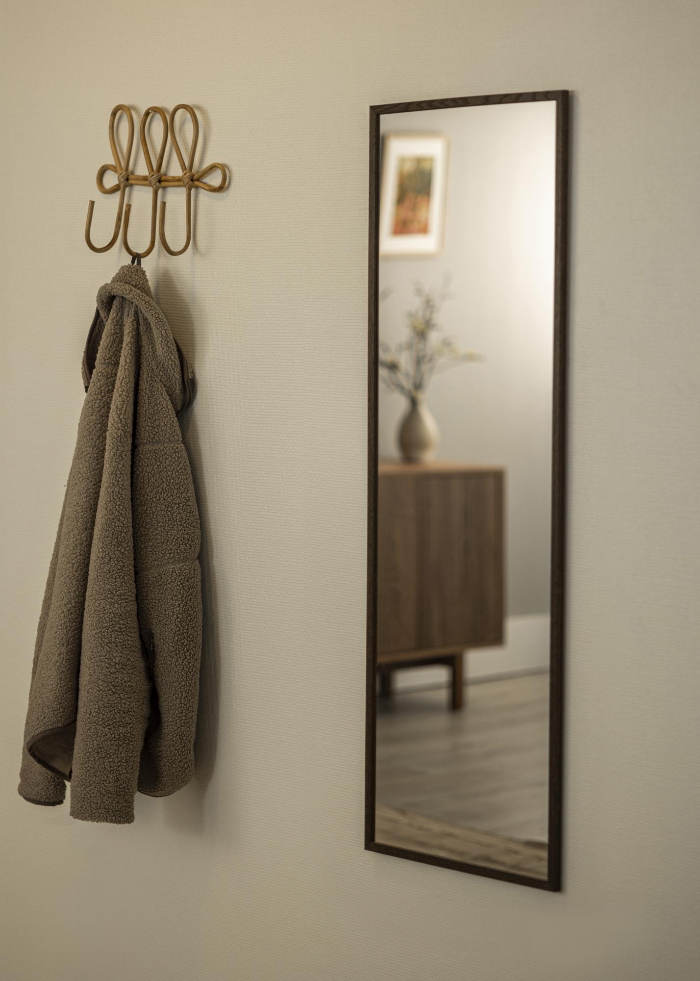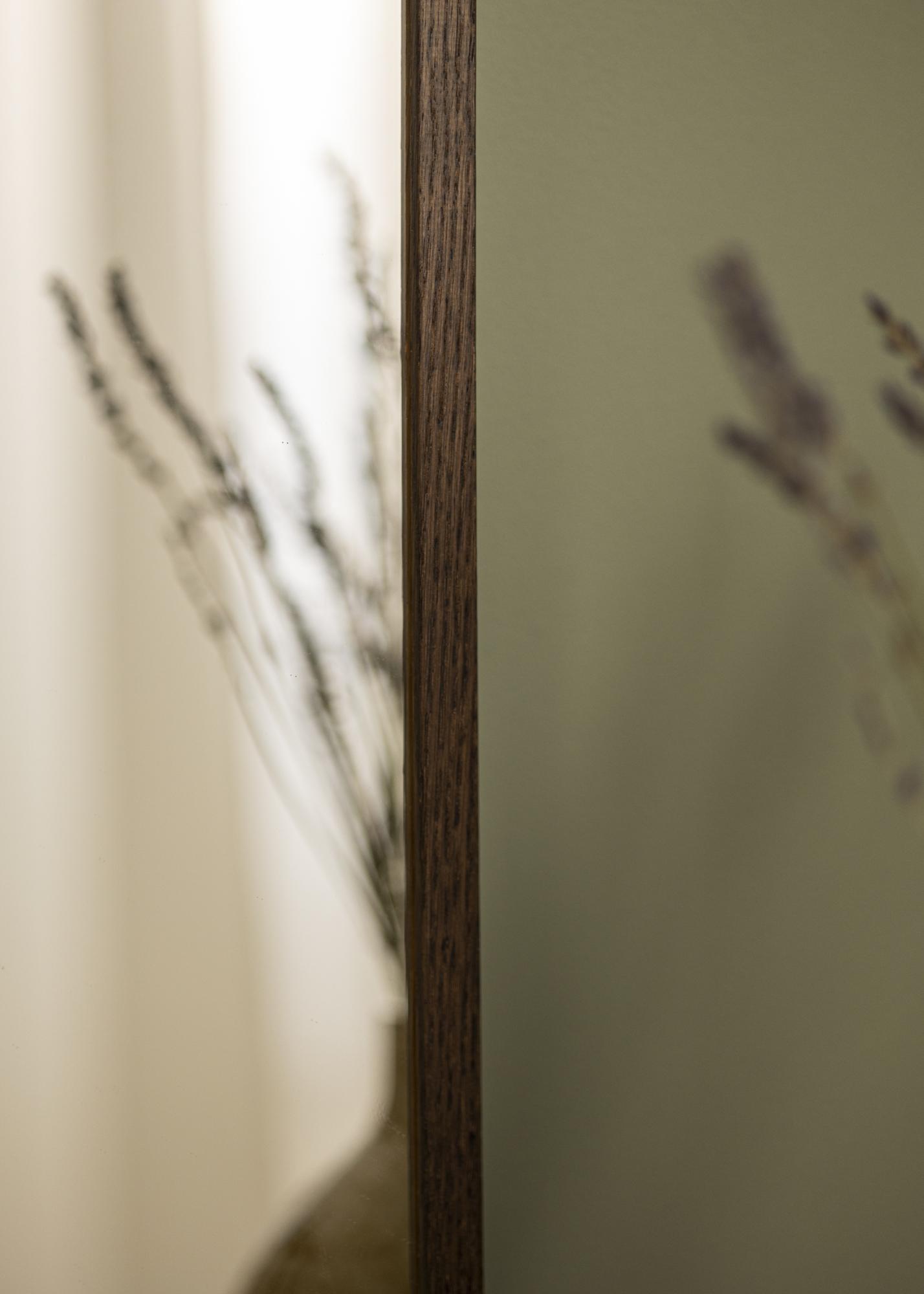 Рамката на огледалото е изработена от истинско дъбово дърво и има дълбок тъмен дъбов нюанс, който веднага привлича вниманието. Дебелата рамка придава усещане за стабилност и допринася за цялостното присъствие на огледалото. Това огледало не е само практичен елемент, но и произведение на изкуството, което допълва както модерните, така и традиционните интериорни стилове.
