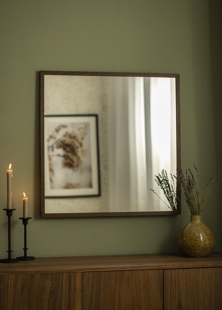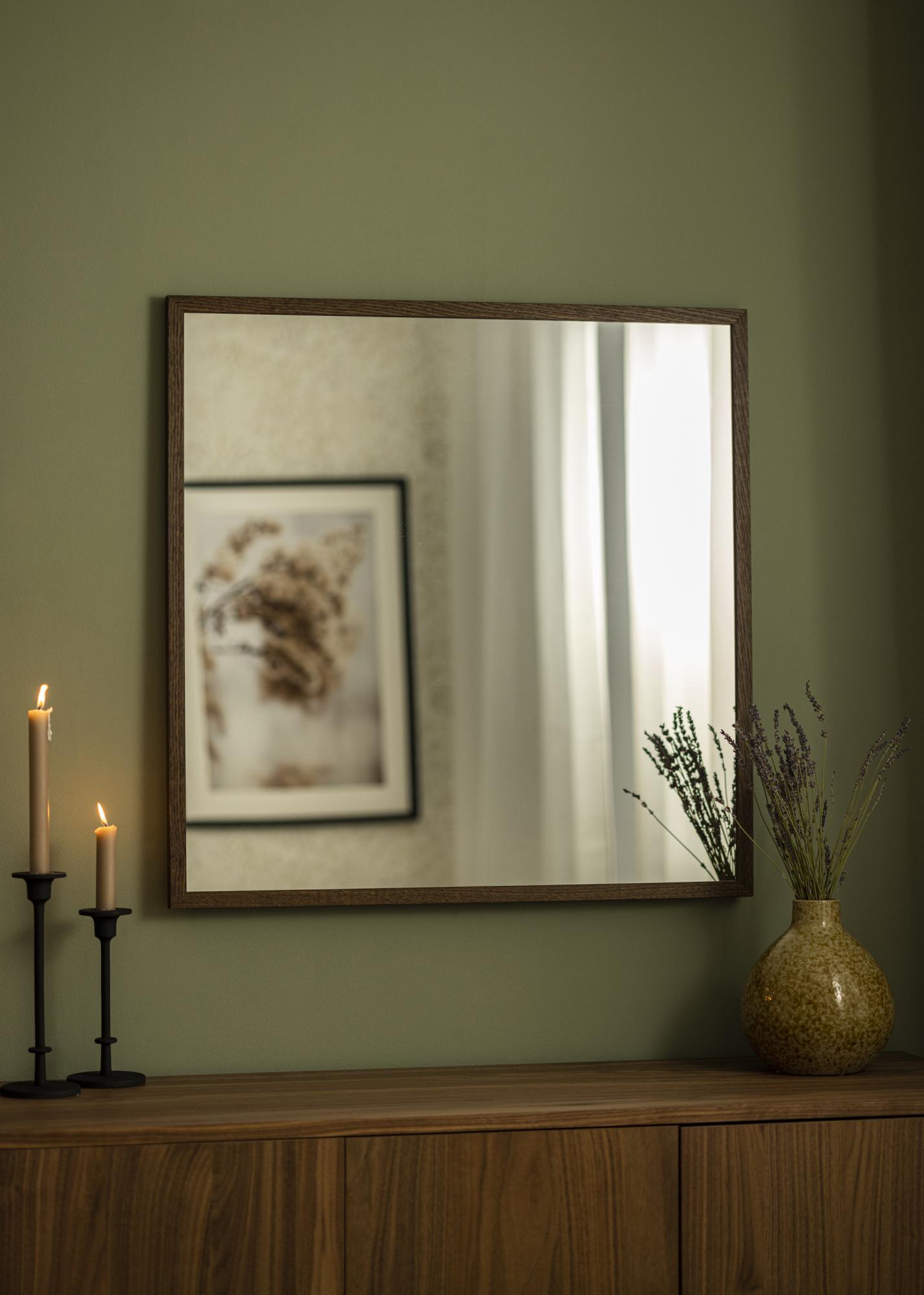 Открийте стилната елегантност с нашето правоъгълно огледало, перфектно проектирано да обогати вашия дом с нотка на класическа красота. Със своите щедри размери от 78x78 cm, огледалото предлага практична и декоративна функция във всяка стая. Дебелата рамка, изработена от истински дъб, има дълбок нюанс на тъмно дърво, който веднага привлича погледа и създава топла и приветлива атмосфера.