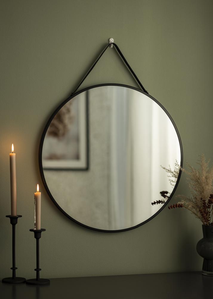 Trapani е стилно стенна огледало с малко допълнителен чар. Огледалото е кръгло и обградено с елегантна рамка от черен метал. Огледалото е фиксирано на стената с много декоративна лента от изкуствена кожа.