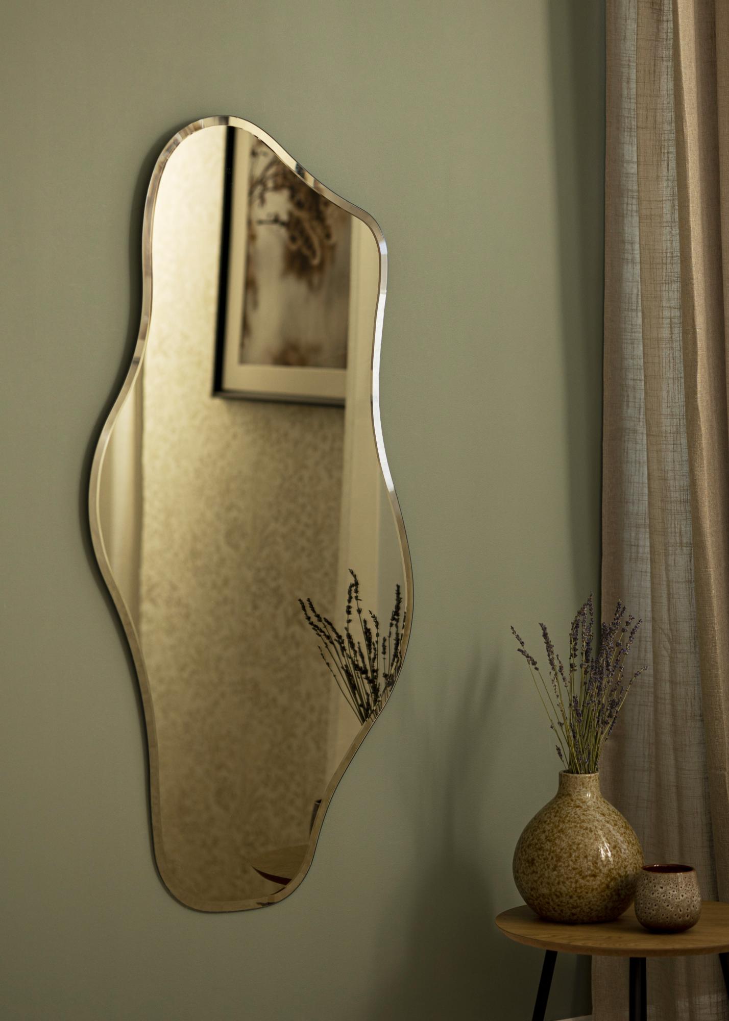 Открийте огледало, което съчетава функция с изключителен дизайн – нашето огледало с вълнообразна форма е истински привличащ погледите елемент. Със своите щедри размери от 55x110 см то предлага просторна отразяваща повърхност, която пасва перфектно както в коридора, така и в спалнята или хола. Формата на това огледало е уникална и вълнообразна, което придава меко и динамично впечатление на стаята.