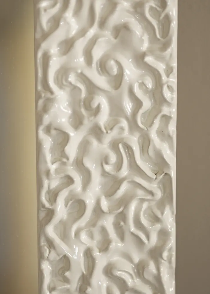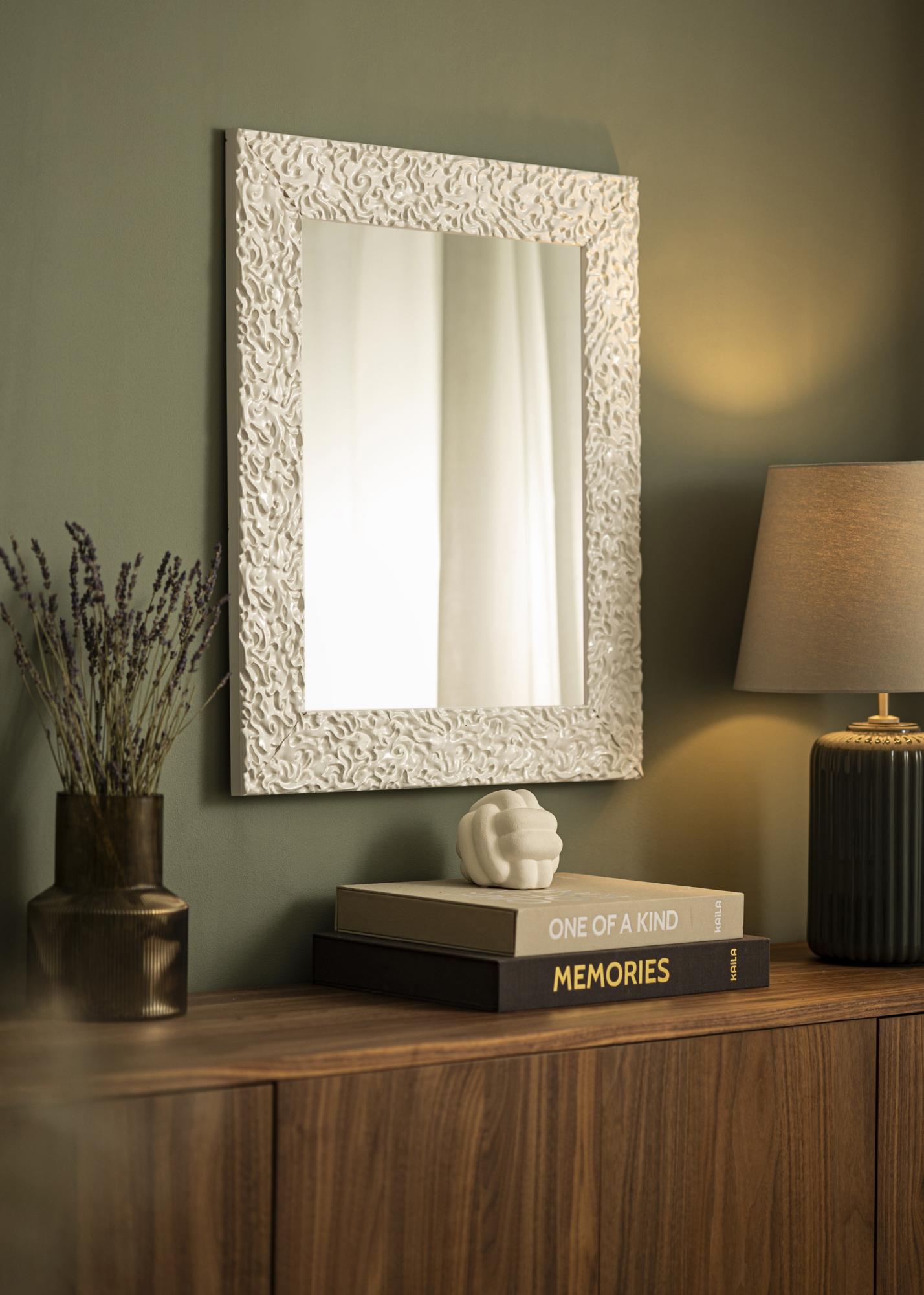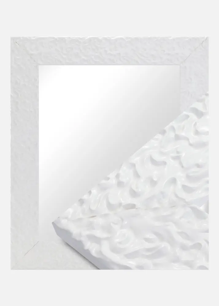 Гланцираната бяла повърхност на огледалото има жив, органичен модел, който създава модерно и елегантно усещане. Този блестящ финиш подчертава меките, плавни форми и придава на рамката изискан израз. Това е перфектното решение за тези, които търсят впечатляващ детайл, който съчетава класическо вдъхновение със съвременен дизайн.