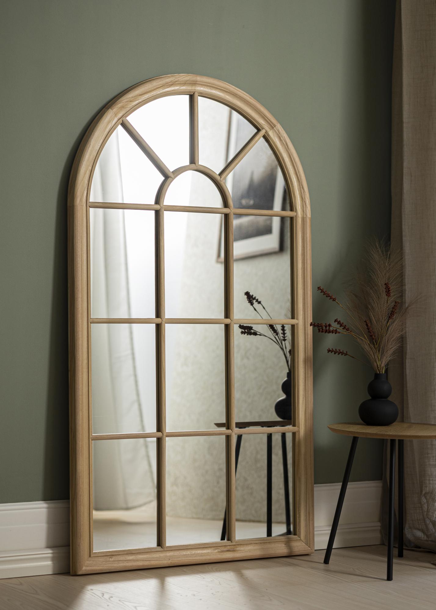 Открийте вечната елегантност с нашето огледало с извита форма, дизайн, който напомня за исторически готически прозорци. Със своите щедри размери от 80x140 см това огледало предлага великолепен изглед и става величествен акцент във вашия дом. Естествената дървена рамка обгръща огледалното стъкло и придава усещане за топлина и традиция на интериора ви.