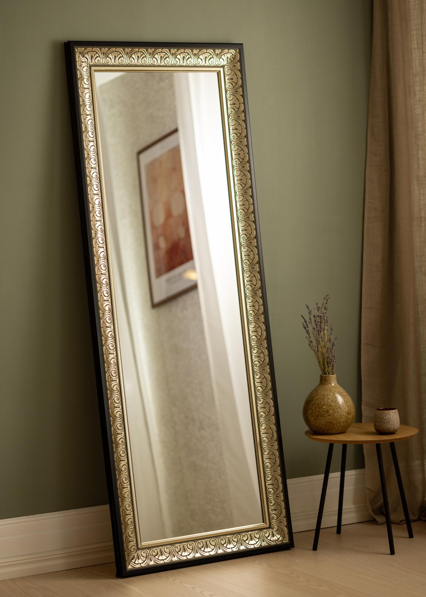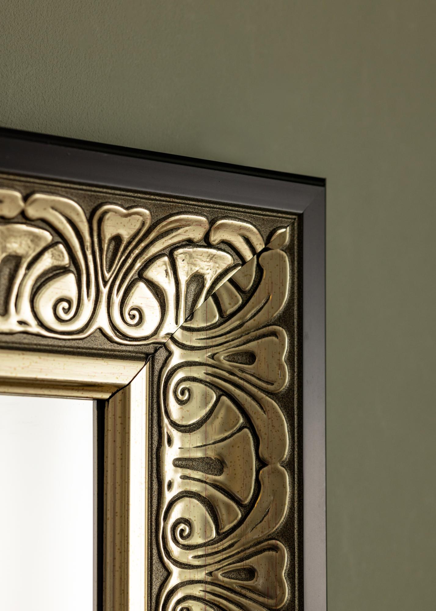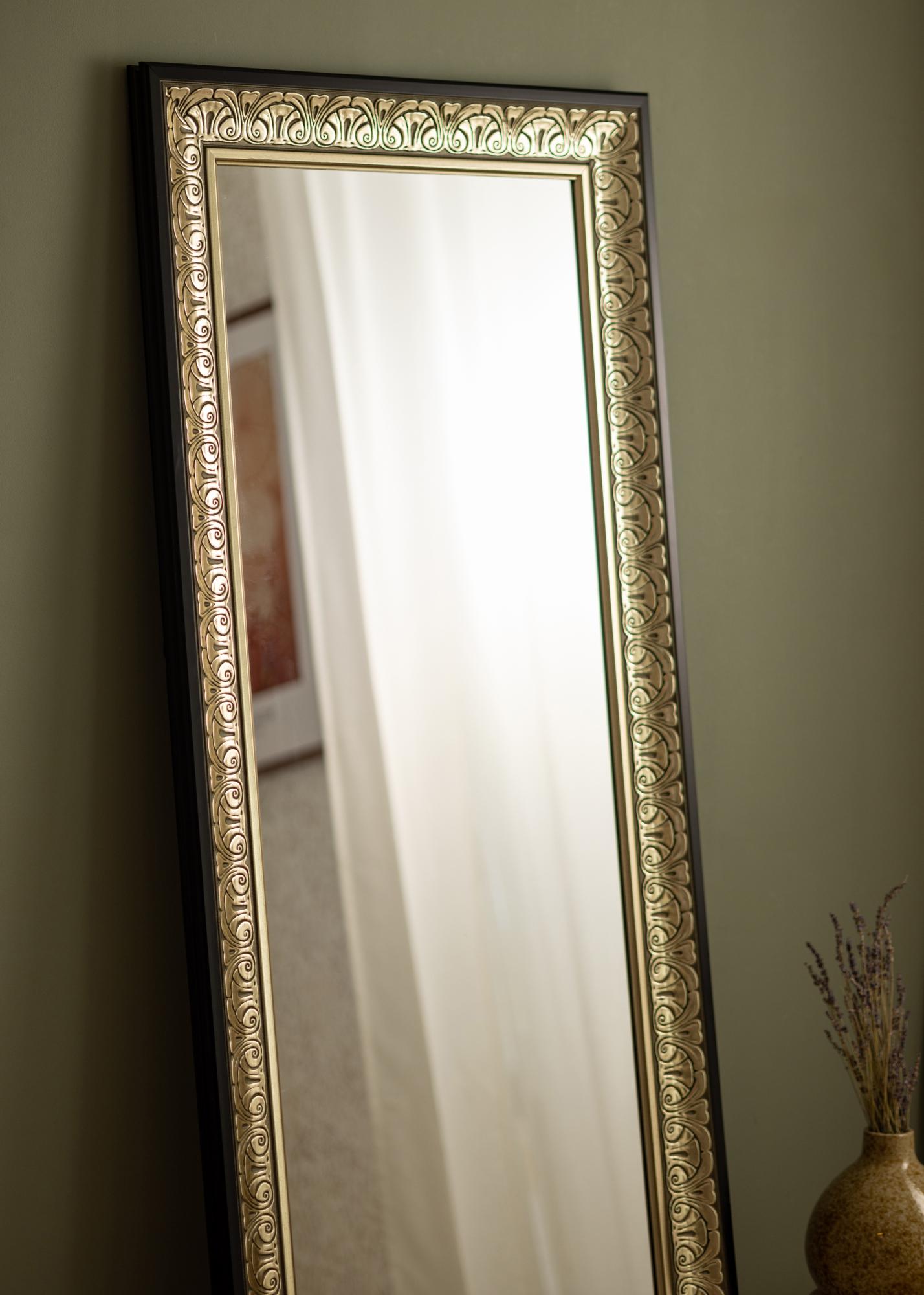 Стилно сребристо орнаментирано огледало, което пасва еднакво добре както в гардеробна стая, така и в коридора или в банята. Външният вид на рамката около огледалото, с вечния си модел, позволява огледалото да се вписва във всякакви стилове на декорация, от романтични пастелноцветни женствени спални до по-елегантни и семпли среди, където огледалото създава контраст. То също така изглежда добре, когато се закачи над шкаф или бюфет, за да придаде усещане за повече пространство в стаята.