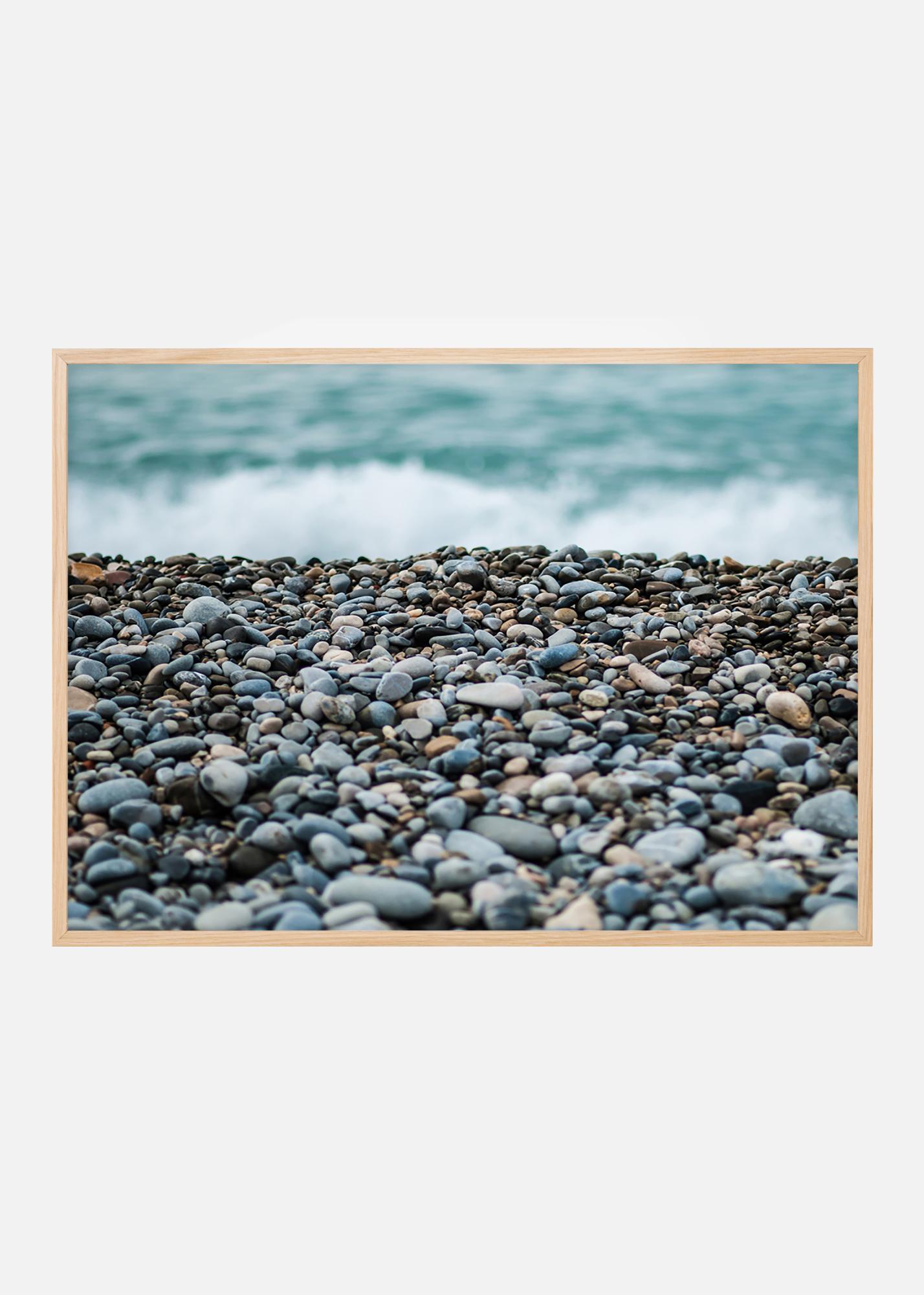 Чуйте шума на морските вълни от този постер с красив каменист плаж на преден план. Кратката дълбочина на полето придава интересна визия, която привлича окото към изображението. Намирате ли заоблени стъклени парчета сред камъните? Сиво-синята цветова гама изглежда добре с тънка рамка на светла стена, за предпочитане с морски аксесоари.