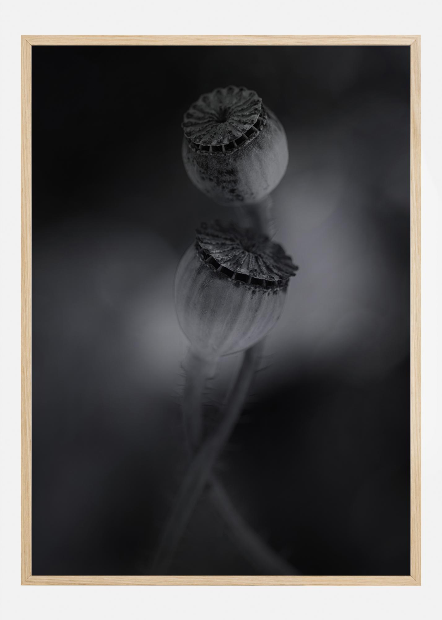 Невероятен черно-бял плакат в близък план с две прецъфтели цветя на мак. Двете семенни кутийки се преплитат, докато естествената светлина създава размазан черен фон. В същото време светлината подчертава красотата на растенията. Добавете нотка на спокойствие в дома си с този печат.