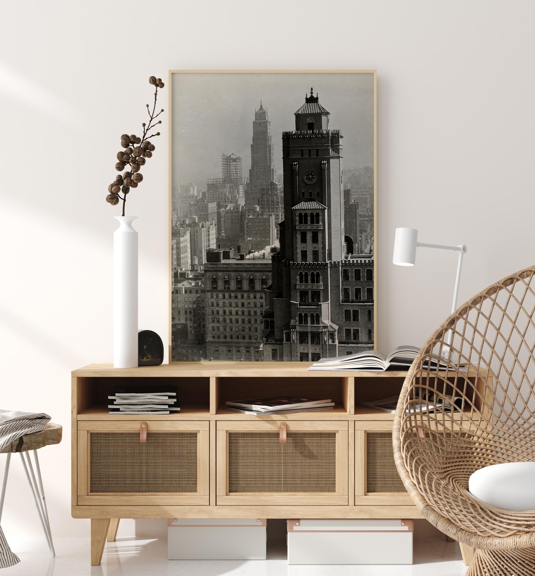 Черен и бял принт с древен град. Сивата линия на града перфектно се вписва със същите сиво оцветени сгради. Градът се състои от сгради с различна височина. На преден план естествената светлина свети директно върху източната страна на основната сграда. Закачете този постер в кабинета си и наблюдавайте древния град.