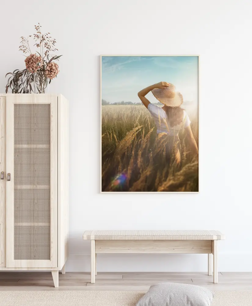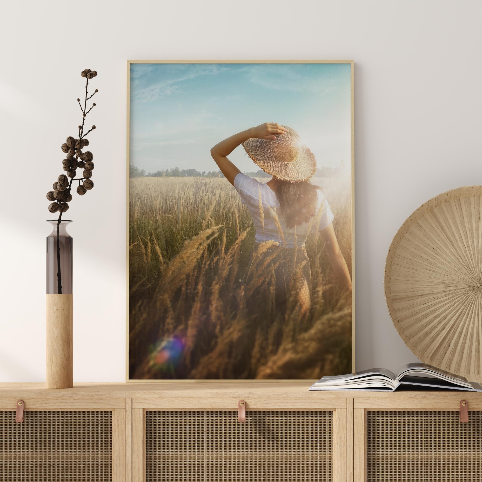 Един релаксиращ и свеж отпечатък на жена със сламена шапка на житните полета. Красивото синьо небе се среща със златистото житно поле. С ръка на главата, млада жена се разхожда из полетата и се наслаждава на свежия въздух. Перфектен плакат за всички, които ценят красотата на природата.