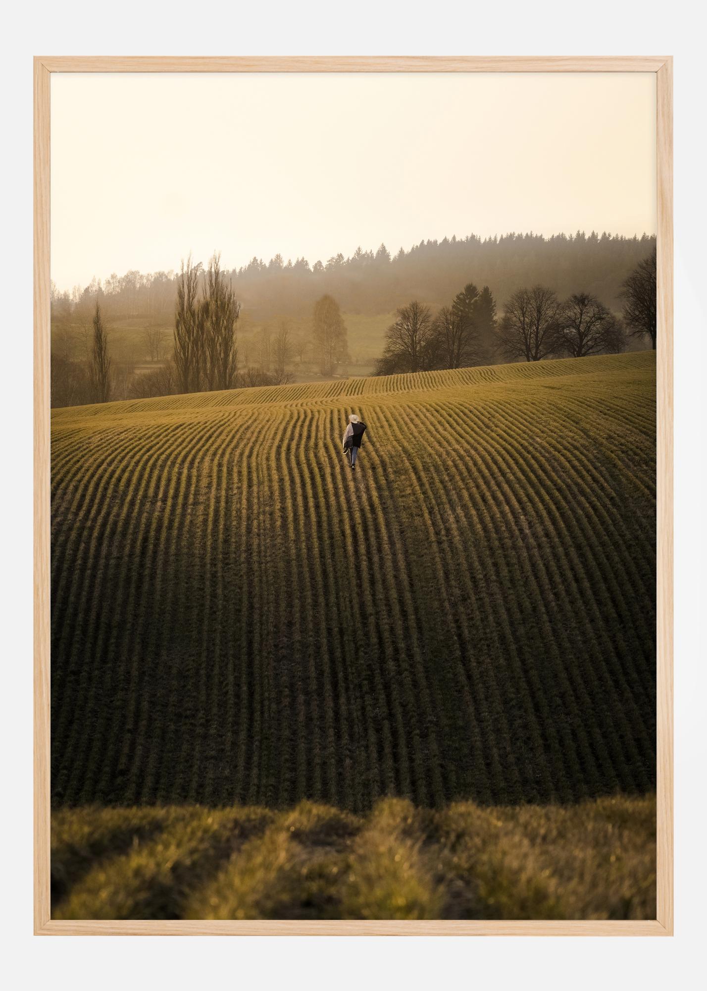 Този постер улавя същината на селската идилия в миг на спокойствие и простота. Самотна фигура се разхожда по симетричните ивици на обработваемо поле, потопена в мек златист час, когато залезът хвърля топлата си светлина върху пейзажа. Тази картина предлага медитация върху ритъма на живота и променящата се красота на природата, като приканва зрителя да се присъедини към тиха разходка из полето.