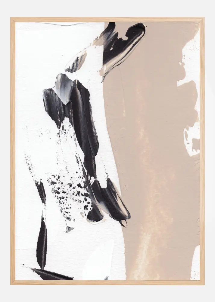 Този смел и експресивен постер е празник на абстрактното изкуство и неговата способност да поражда емоции и интерпретации. Динамичната композиция от черни и сиви четки върху кремавия фон илюстрира движение и мимолетната природа на креативността. Разпръснати пръски и капки добавят органично усещане и показват ръката на художника във всяка линия и форма.