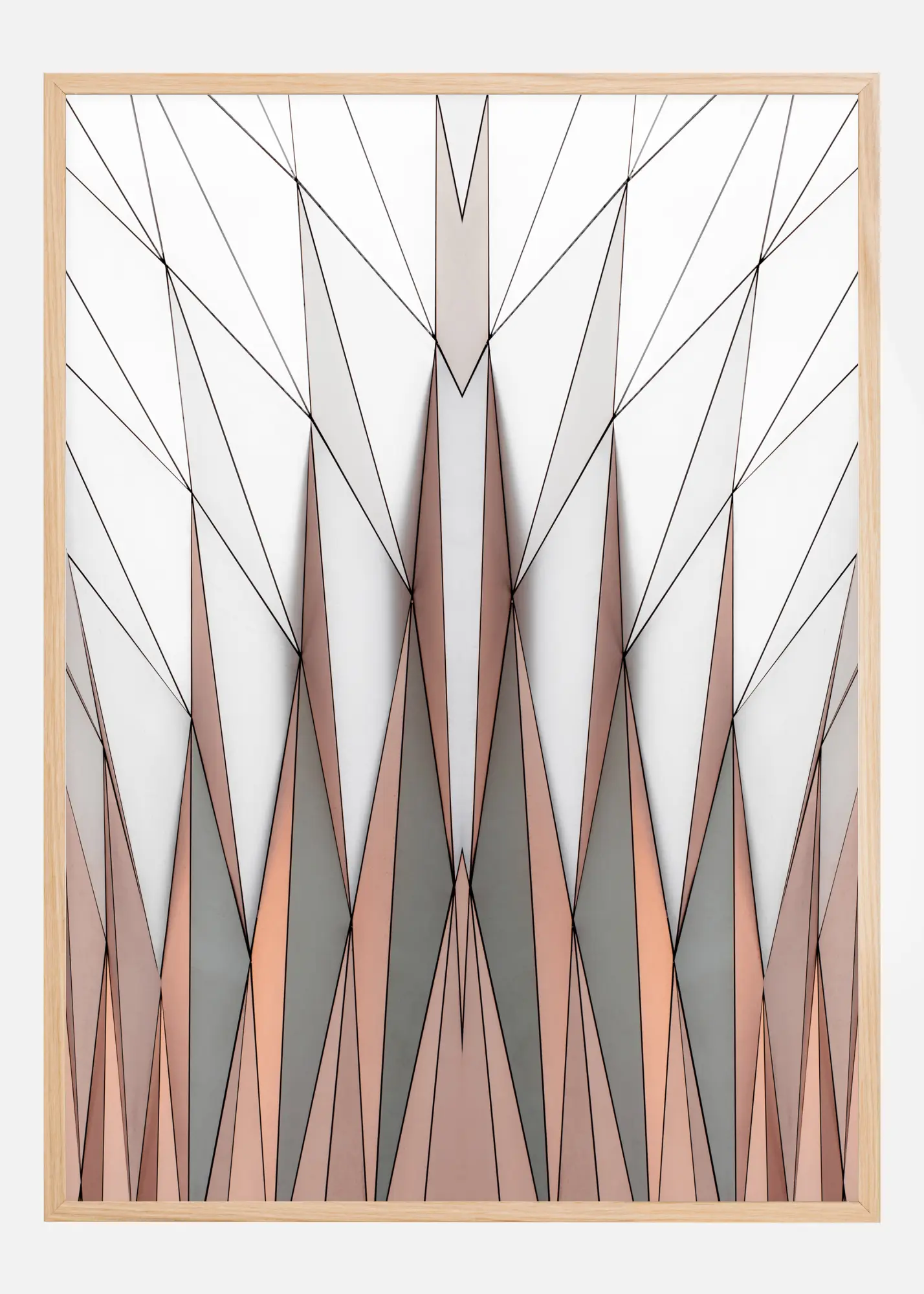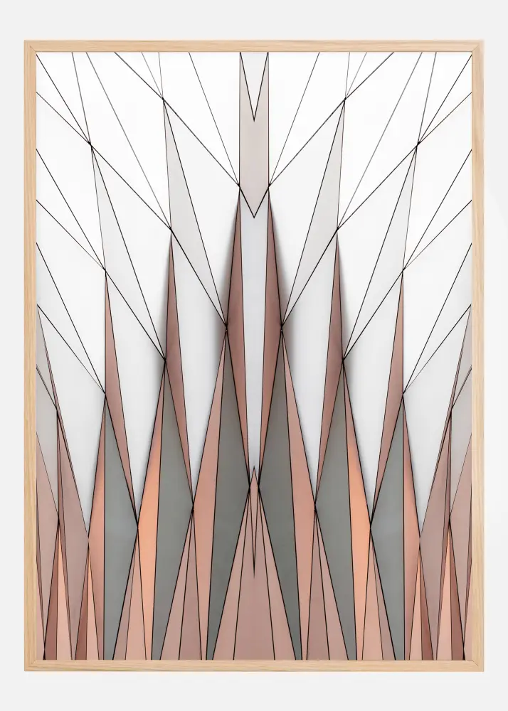Красив отпечатък с триъгълници. Оранжевите и сиви триъгълници са разположени в долната част на отпечатъка и сочат нагоре. Останалите триъгълници с форма на диамант обаче покриват горната половина на отпечатъка. Фантастичен постер, когато искате да създадете усещане за пространство. Перфектен за стената в хола.