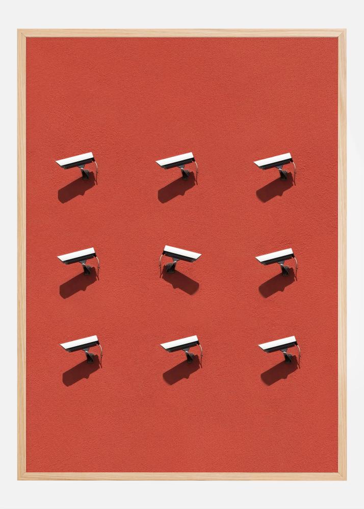Този замислящ постер създава силно визуално впечатление със своето минималистично, но мощно послание. Чрез изобразяване на редица от камери за видеонаблюдение на едноцветен фон, изображението приканва наблюдателя да размишлява върху теми като наблюдение и личен живот в съвременното общество. Неговата проста композиция и смелото използване на цвят придават силно и същевременно стилно изражение.