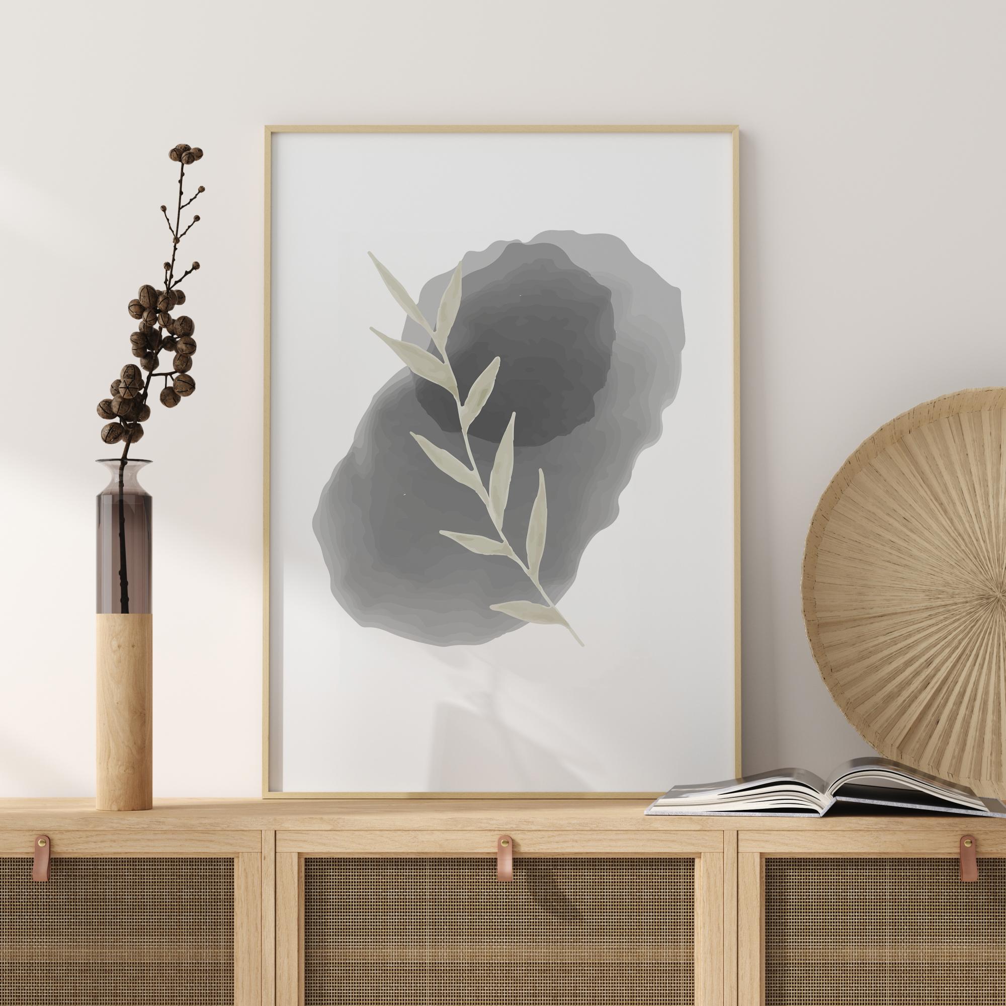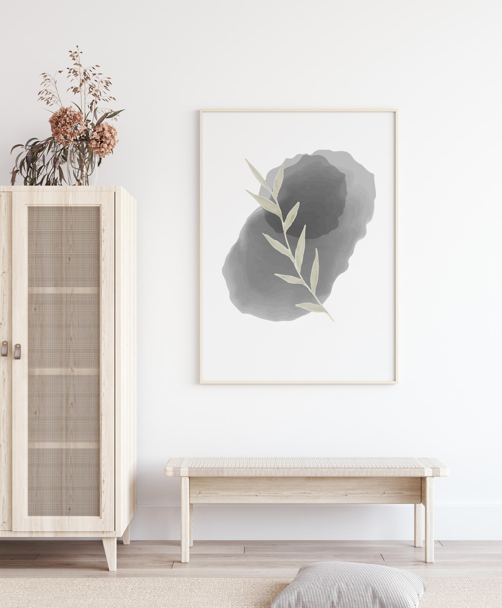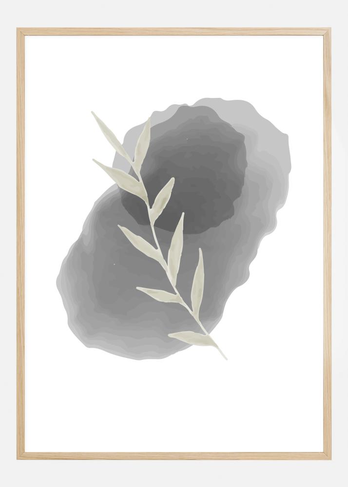 Просто изображение на бежов лист, поставен върху овална форма на камък. На бял фон листът е поставен върху два различни камъка: малък черен камък, поставен върху по-голям бежов камък. Добавете нотка деликатност в дома си с този постер.