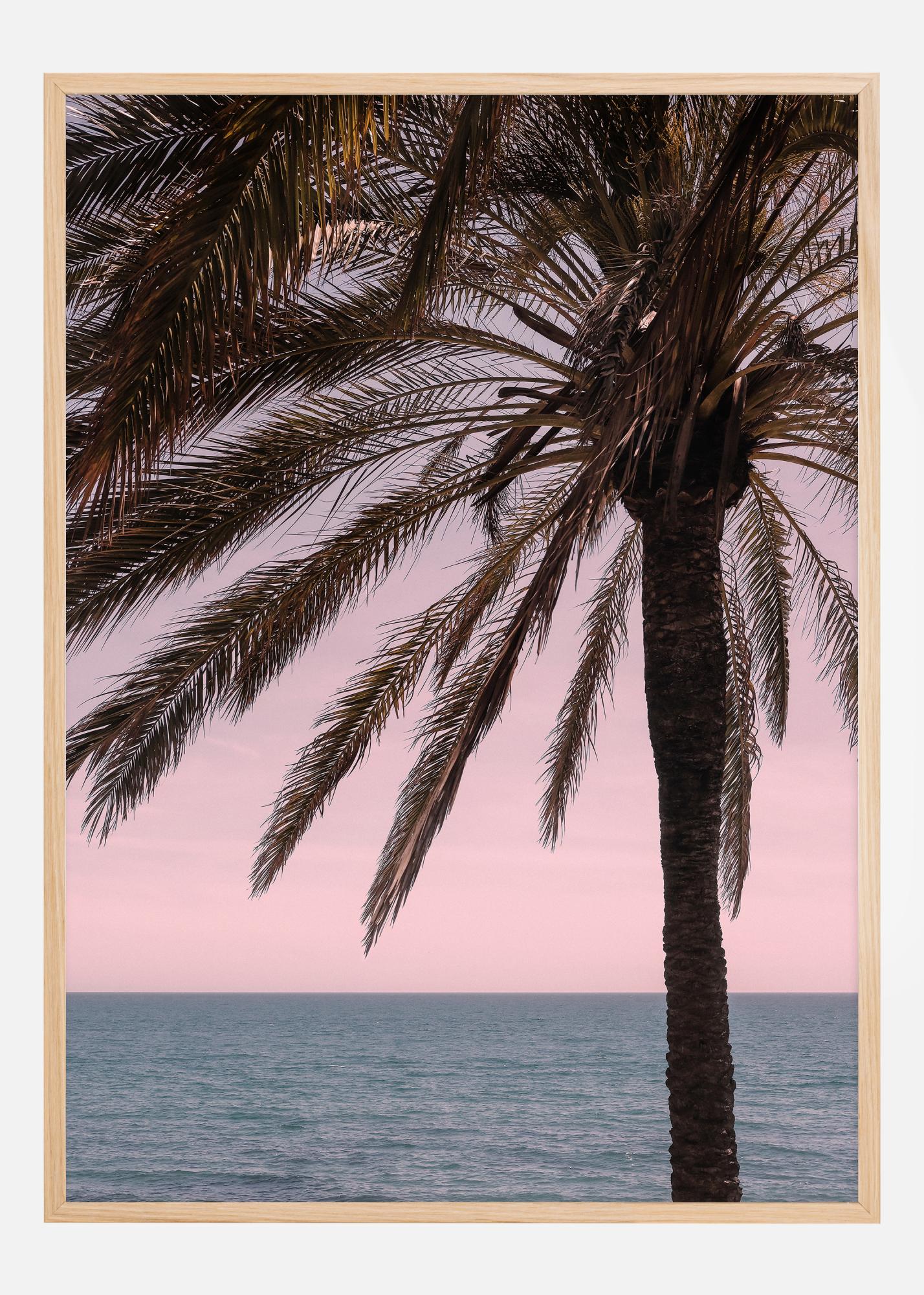 Позволете си бягство към тропическия рай всеки ден с този постер, който представя величествена палма срещу небе по изгрев. Този принт улавя спокоен момент до морето, където мекото розово сияние на здрача среща безкрайното синьо на хоризонта, а силуетът на палмата създава ярък контраст със цветното небе. Перфектен за добавяне на усещане за вечна лятна топлина към вашия дом или офис.