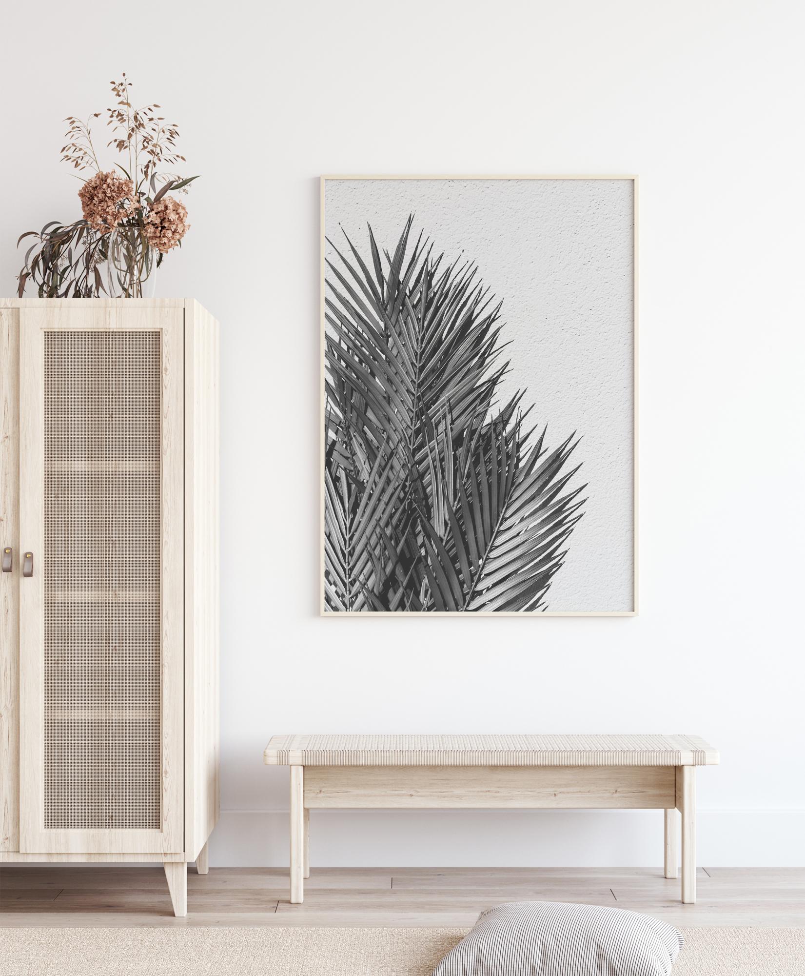 Черно-бял постер с палмови листа, които се накланят срещу груба бяла стена. Грубата стена подчертава палмовите листа, които лежат едно върху друго. Когато стоите отляво на картината, почти можете да почувствате как топлината достига до листата. Окачете този отпечатък във вашата лятна вила за тропическа атмосфера.