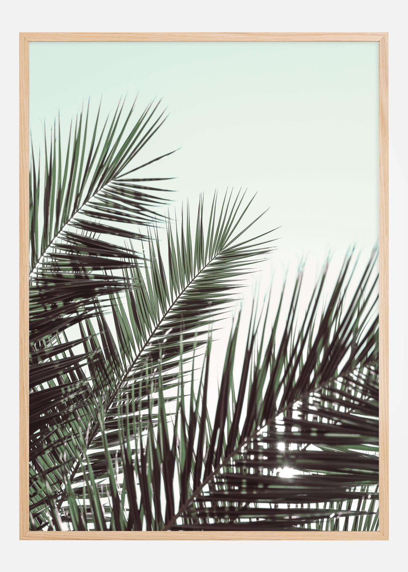 Превърнете дома си в тропически оазис с този изискан постер, който изобразява буйни палмови листа на фона на пастелно небе. Тази афиша улавя лекия бриз и спокойствието, които могат да се намерят само в топъл климат. Детайлните зелени листа са красиво представени на фона на меко небесносиньо, създавайки усещане за вечна лято и природa в вашето пространство.