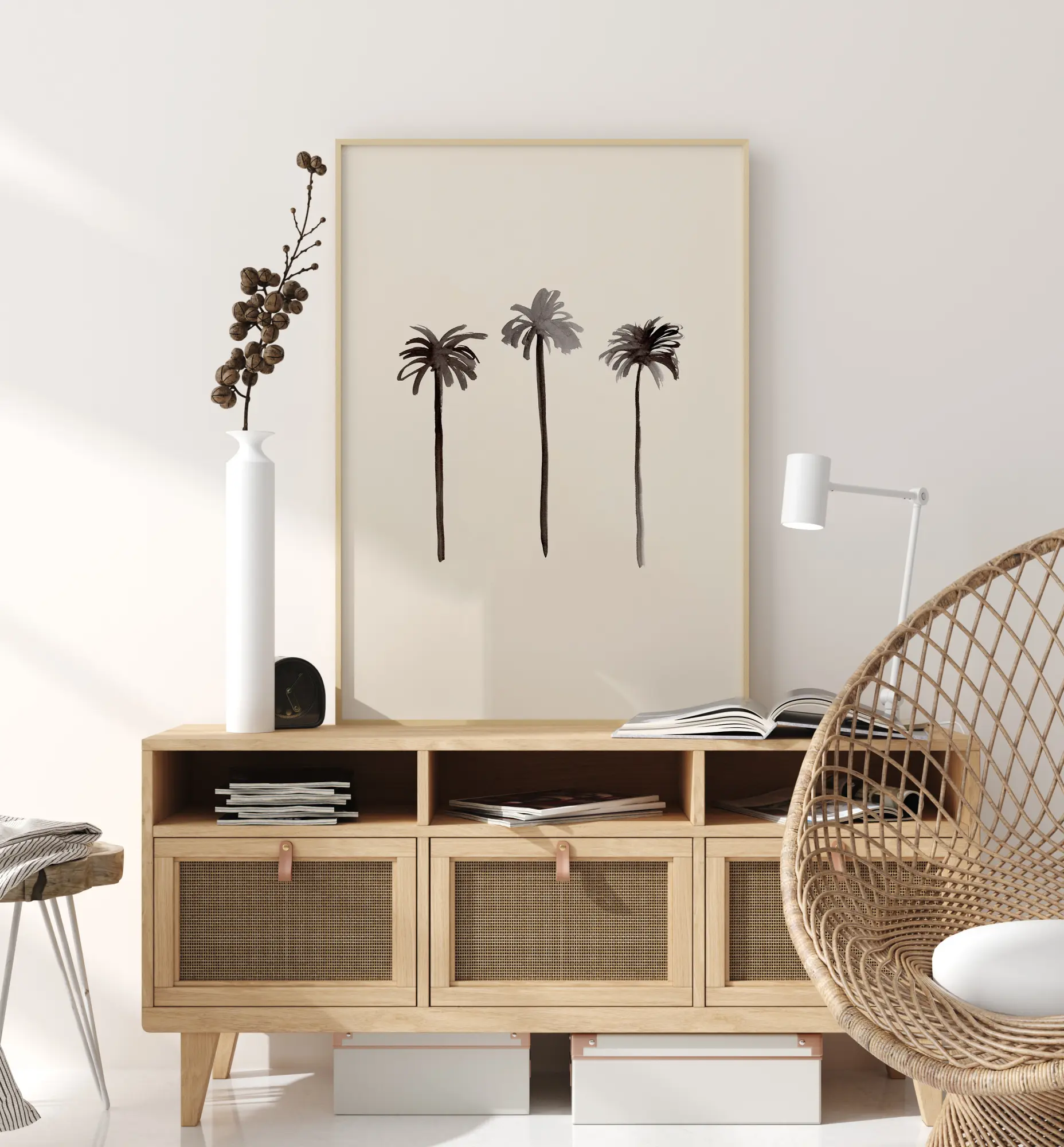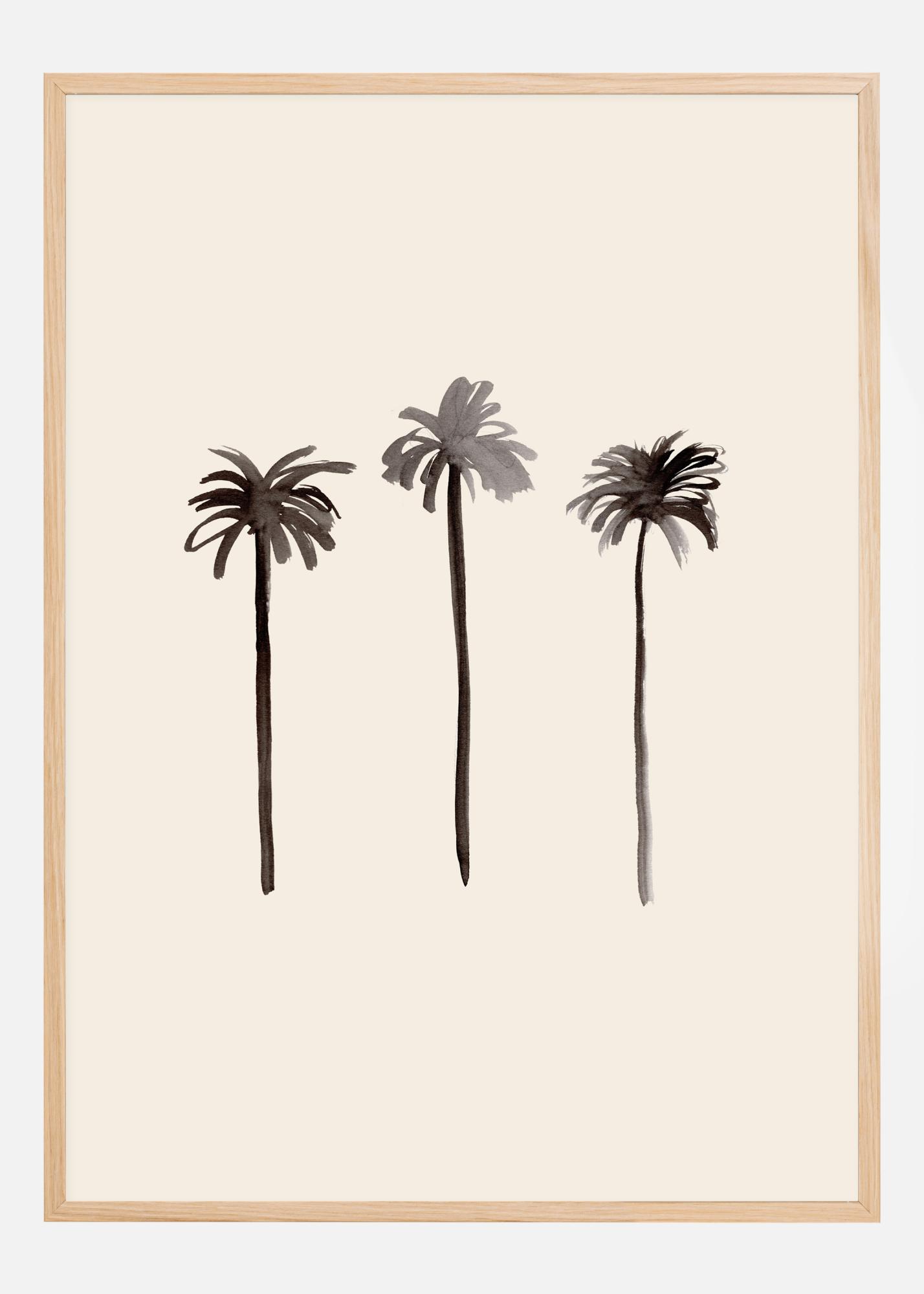 Просто черно-бяло ръчно отпечатък с три палми в редица. На бежов фон са използвани различни нюанси на черното, за да се създаде тъмнината на листата. Обикновен плакат, който е подходящ за окачване на стената в хола.