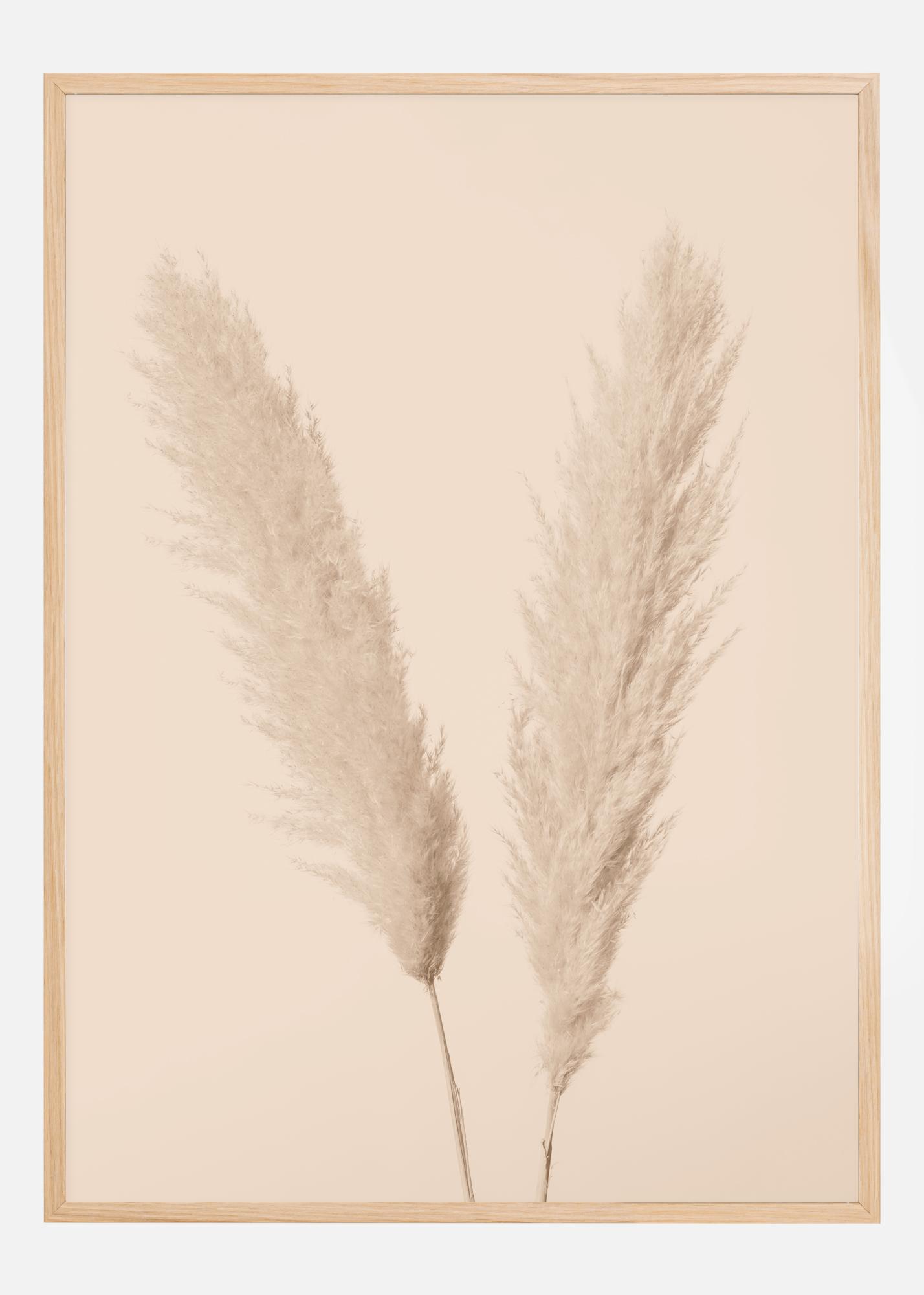 Един близък план с две глави от пампасова трева. Пастелните цветове и розовите тонове в това изображение наистина подчертават пухкавите стъбла на тревата. Можете почти да усетите как спокойствието идва на вълни, докато гледате този плакат.