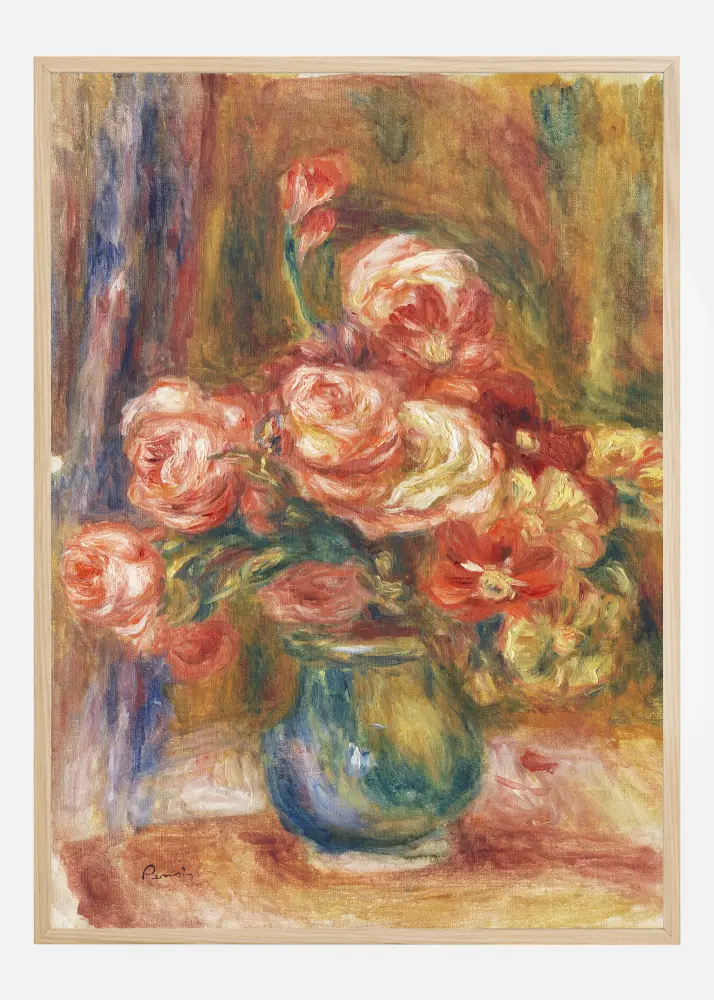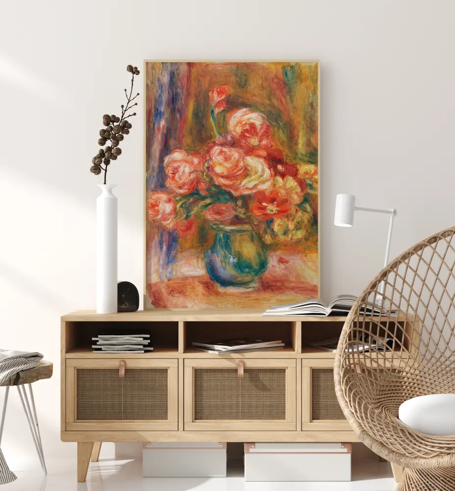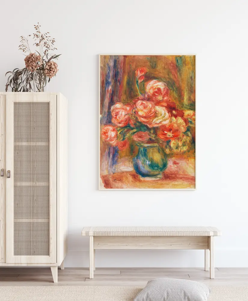 Красива ръчно рисувана розова букет. Тази невероятна творба на оранжеви и червени рози в зелена и оцветена ваза създава топло и успокояващо усещане. Комбинацията от цветове на многоцветен фон се слива перфектно. Нека вашият дом заблести с помощта на този прекрасен плакат.