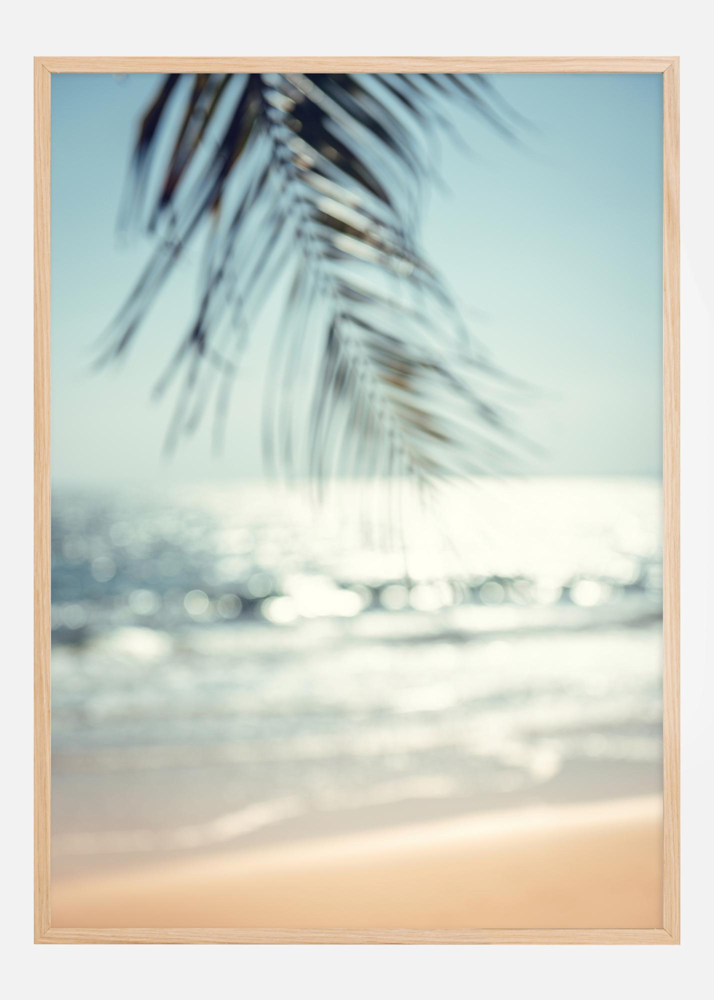 Този плакат е мечтателно бягство към тропически ширини и успокояващи пейзажи. Мотивът се фокусира върху размит палмов клон, който се простира през изображението, с искрящо море и златист плаж на заден план. Цветната палитра излъчва топлина и релаксация със своите меки нюанси на синьо, тюркоазено и пясък, които заедно създават усещане за слънчеви дни край морето.