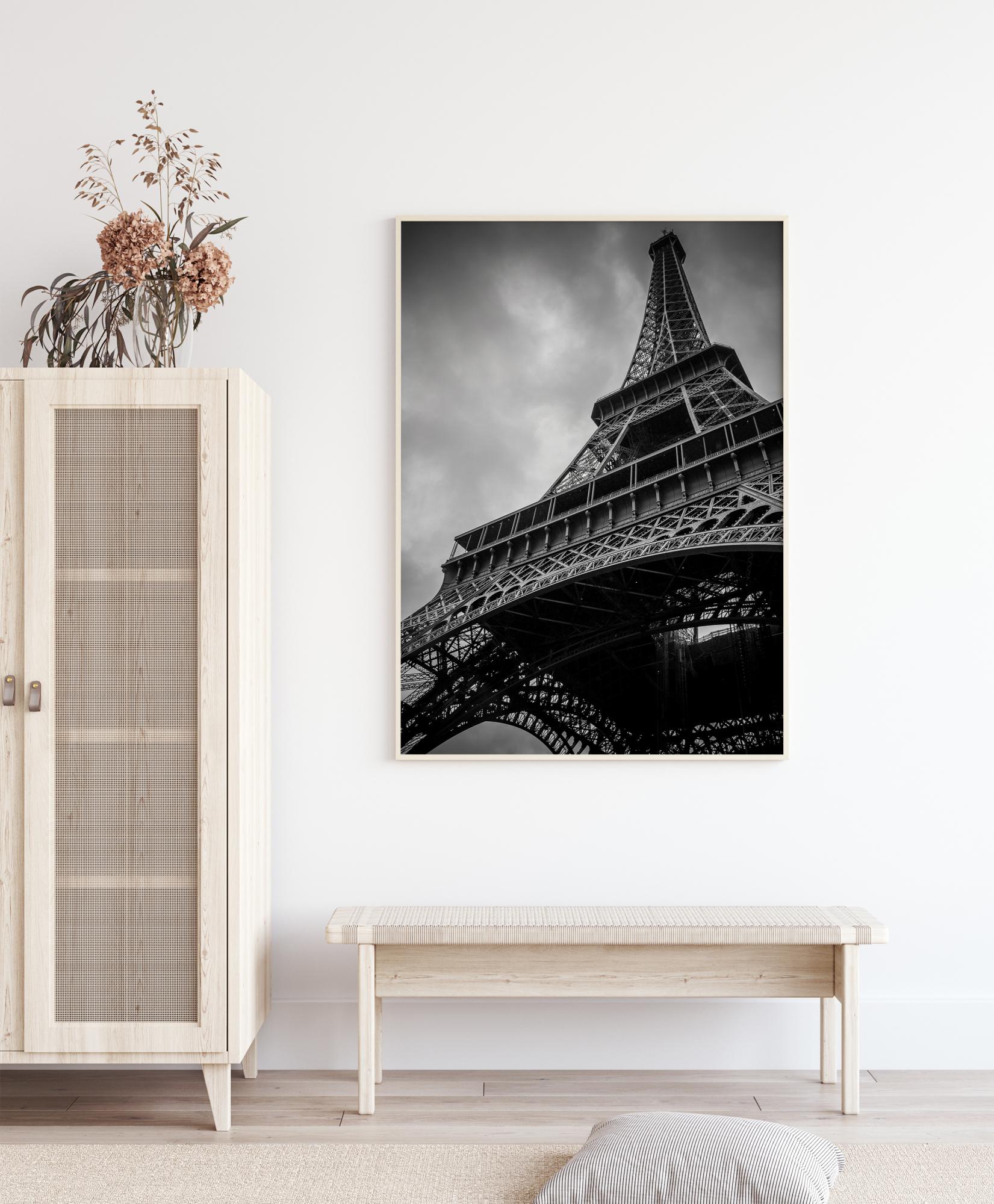 Перспективен плакат отдолу на зашеметяващата Айфелова кула. Със сивото облачно небе тази красива железна структура показва своята пирамидоподобна форма, издигайки се високо. За всички, които обичат Париж, това е перфектен печат за подарък.