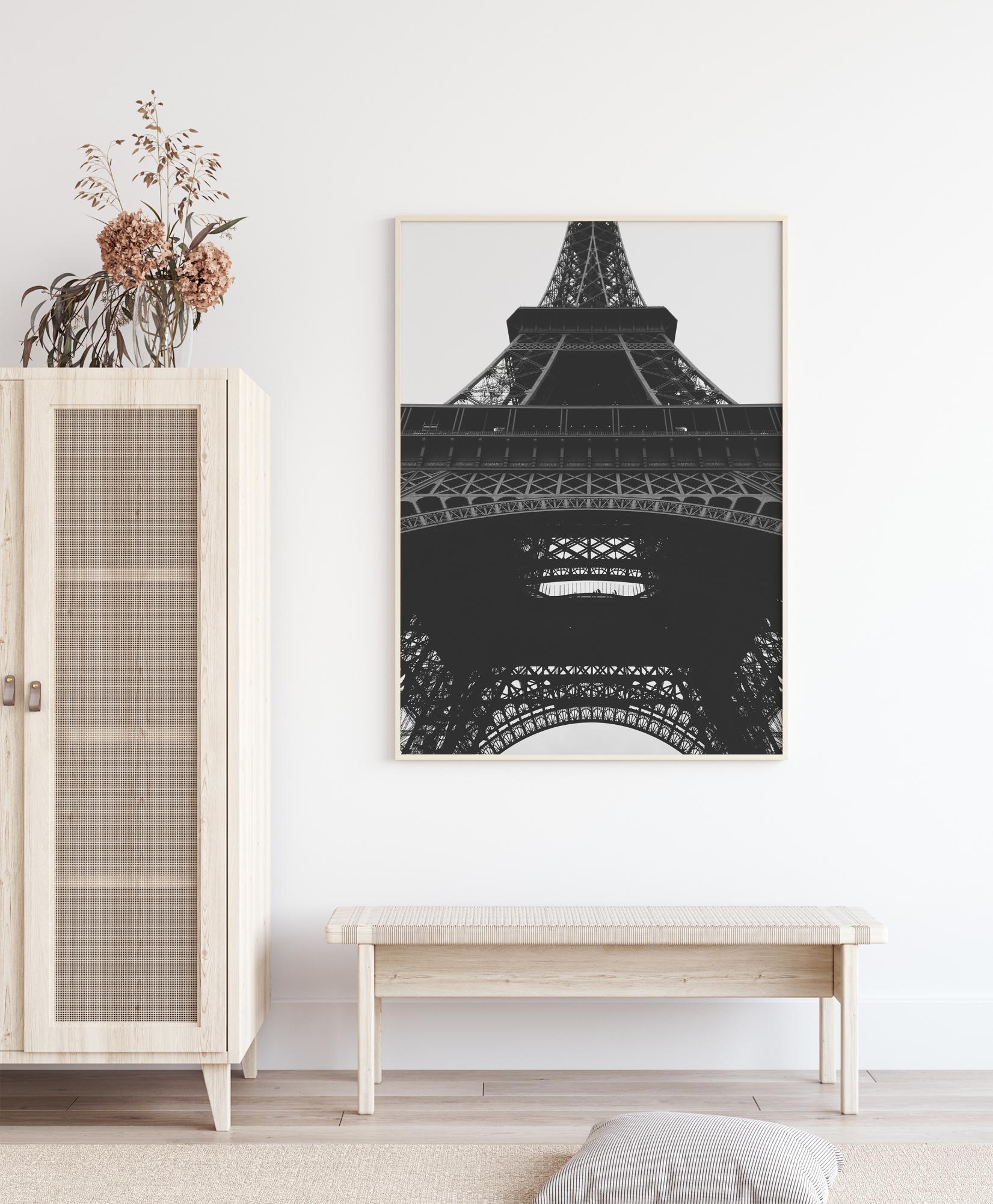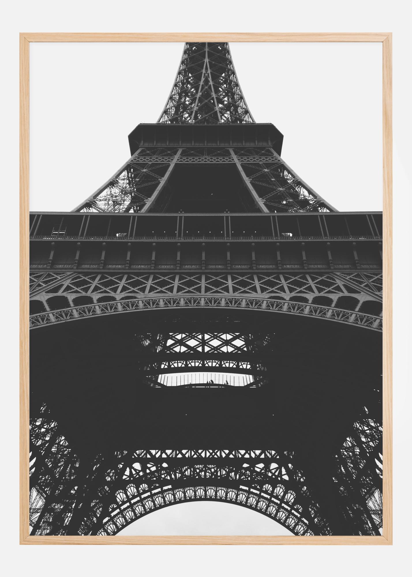 Един фантастичен черно-бял плакат с Айфеловата кула. Снимката на масивната железна структура е направена от перспектива на жаба, което позволява кулата да се слее перфектно със сивото небе. Това техническо произведение на изкуството създава лека, ефирна и здрава структура. Идеален печат за окачване в модерна обстановка.