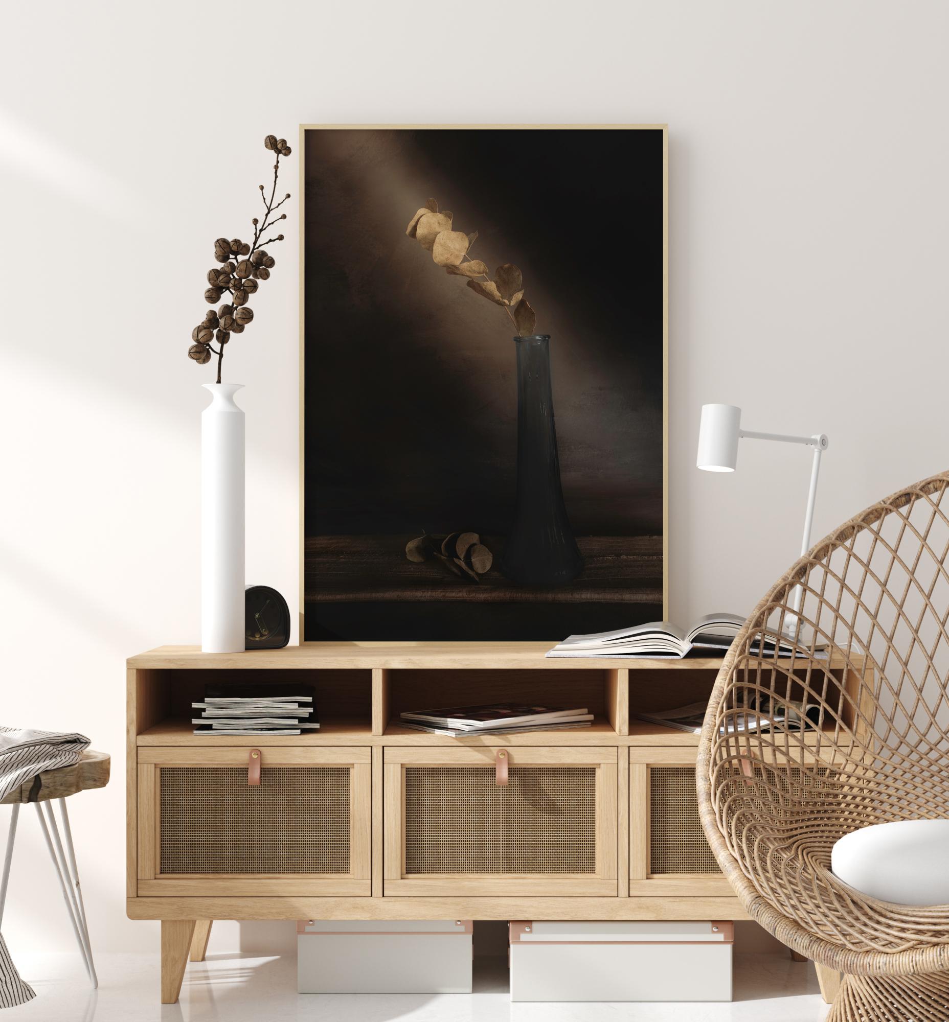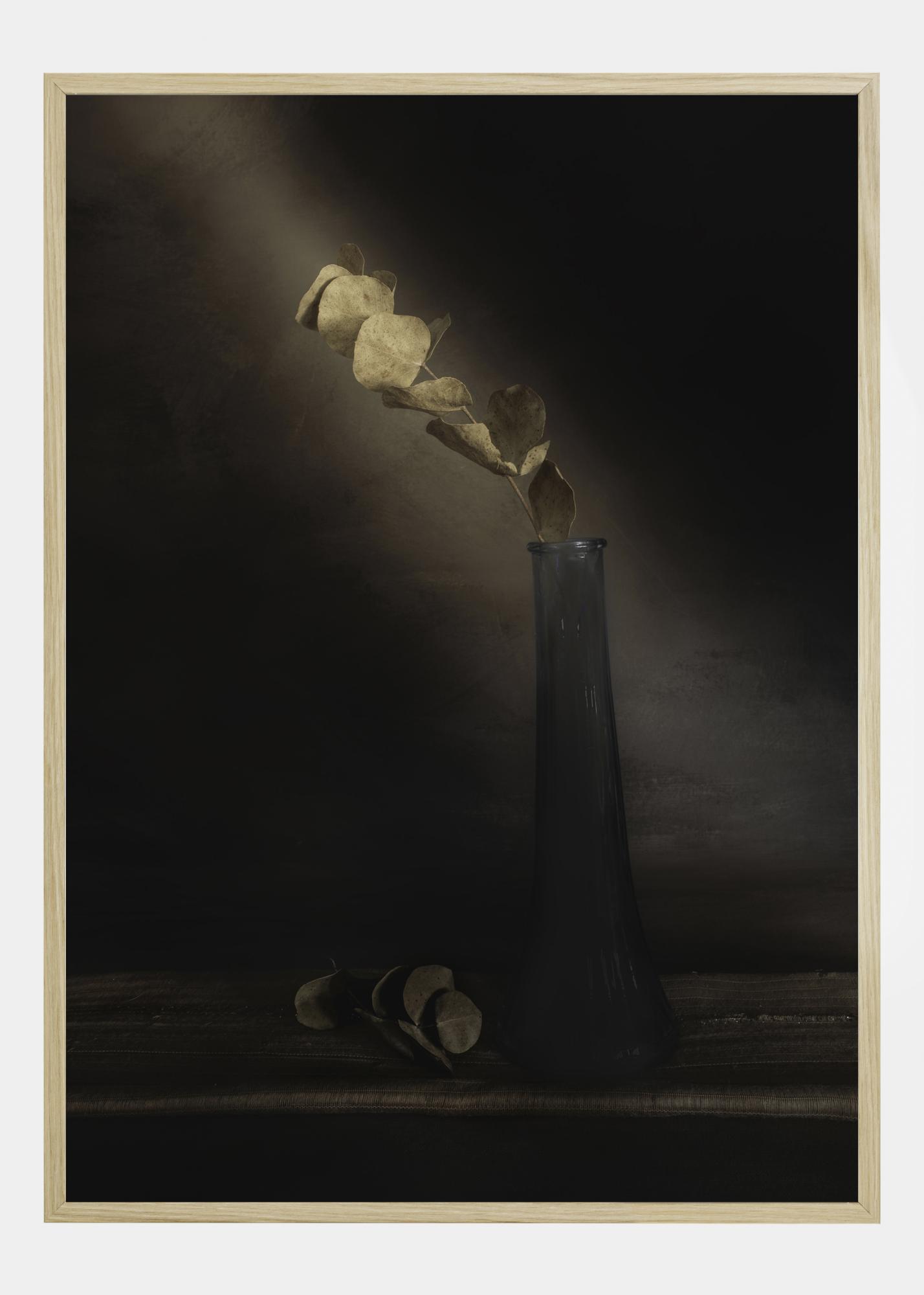 Един прост, но красив отпечатък на прост стъбъл с изсъхнали листа в стъклена ваза. На светлокафяв фон естествената светлина пада директно върху изсъхналата трева. В долната част на изображението лежи колекция от листа, които са паднали от стъблото. Прекрасен постер за окачване в спокойно обкръжение.